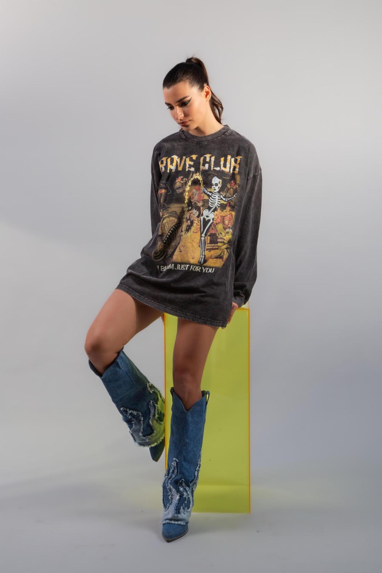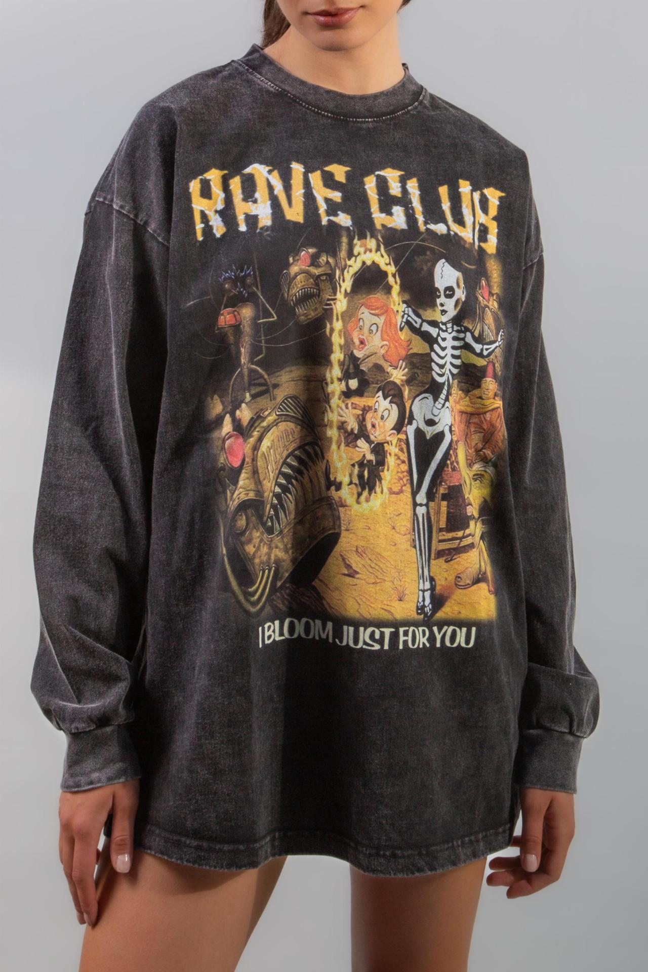 A washed black top with a large rave inspired graphic on the front.