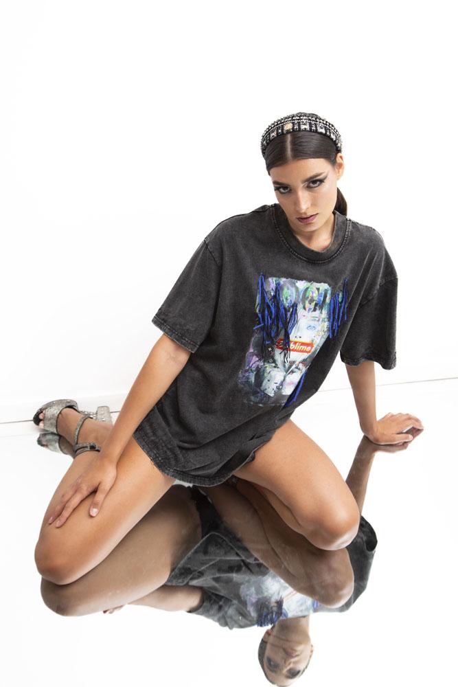 A washed black oversized top with a graphic print and blue fringe details.