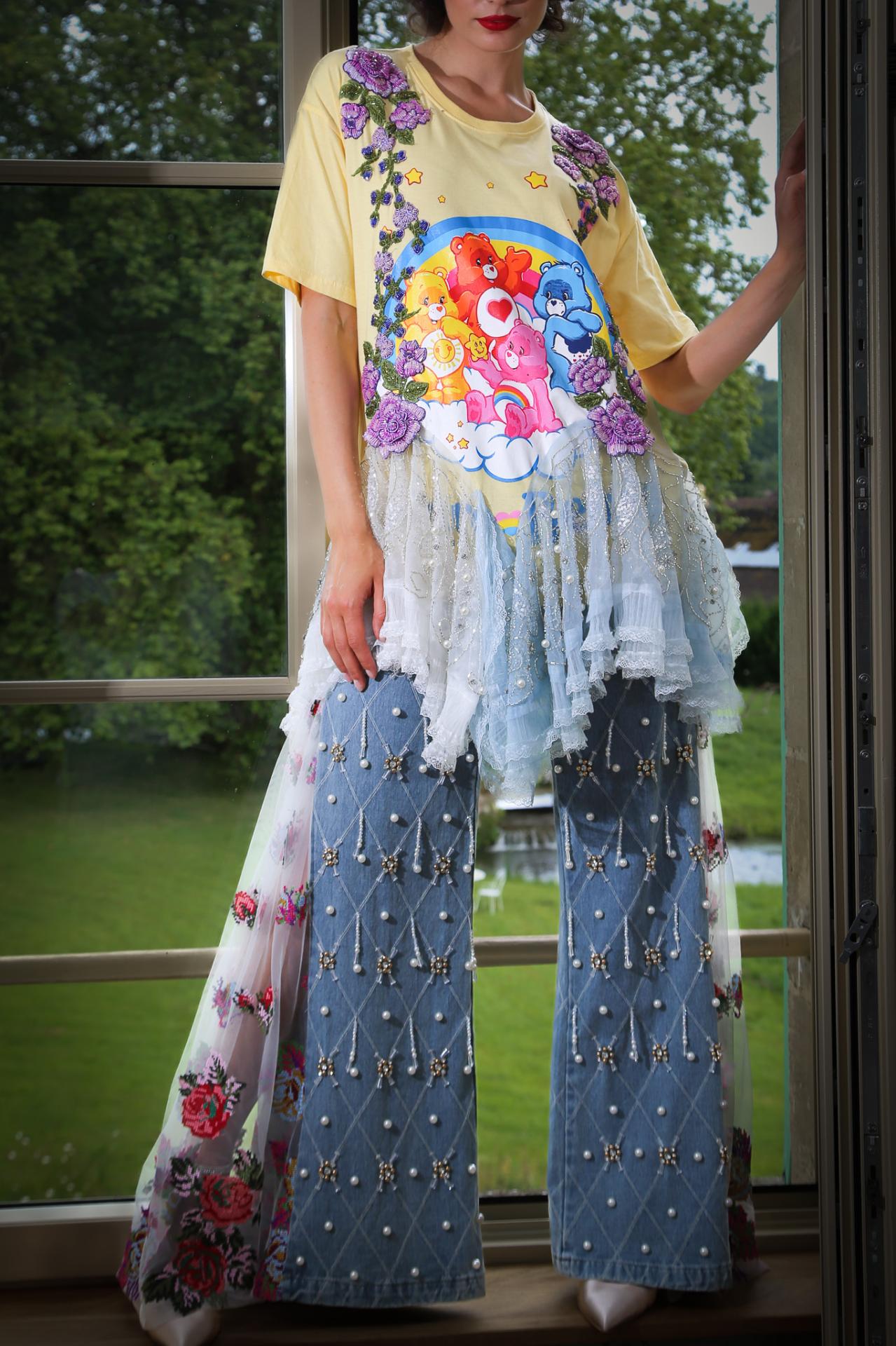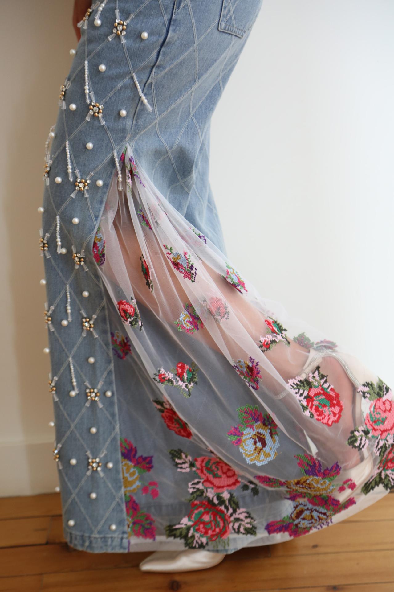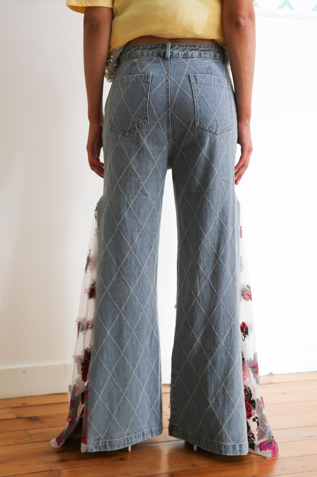 The relaxed, straight-leg fit brings comfort and effortless movement, while the embroidered tulle panels add volume, elegance, and a whisper of fantasy to every step. Whether worn with a simple top to highlight the artistry or paired with more elevated pieces for an editorial evening look, these jeans embody romantic sophistication and contemporary creativity.