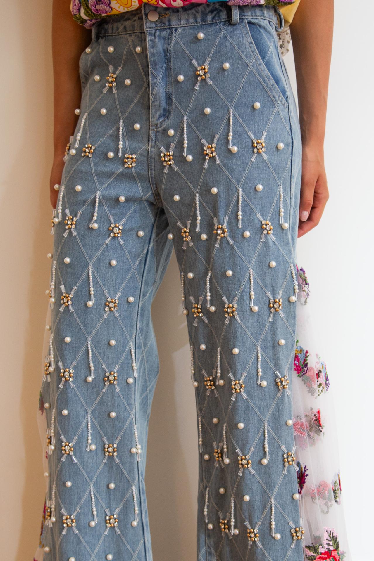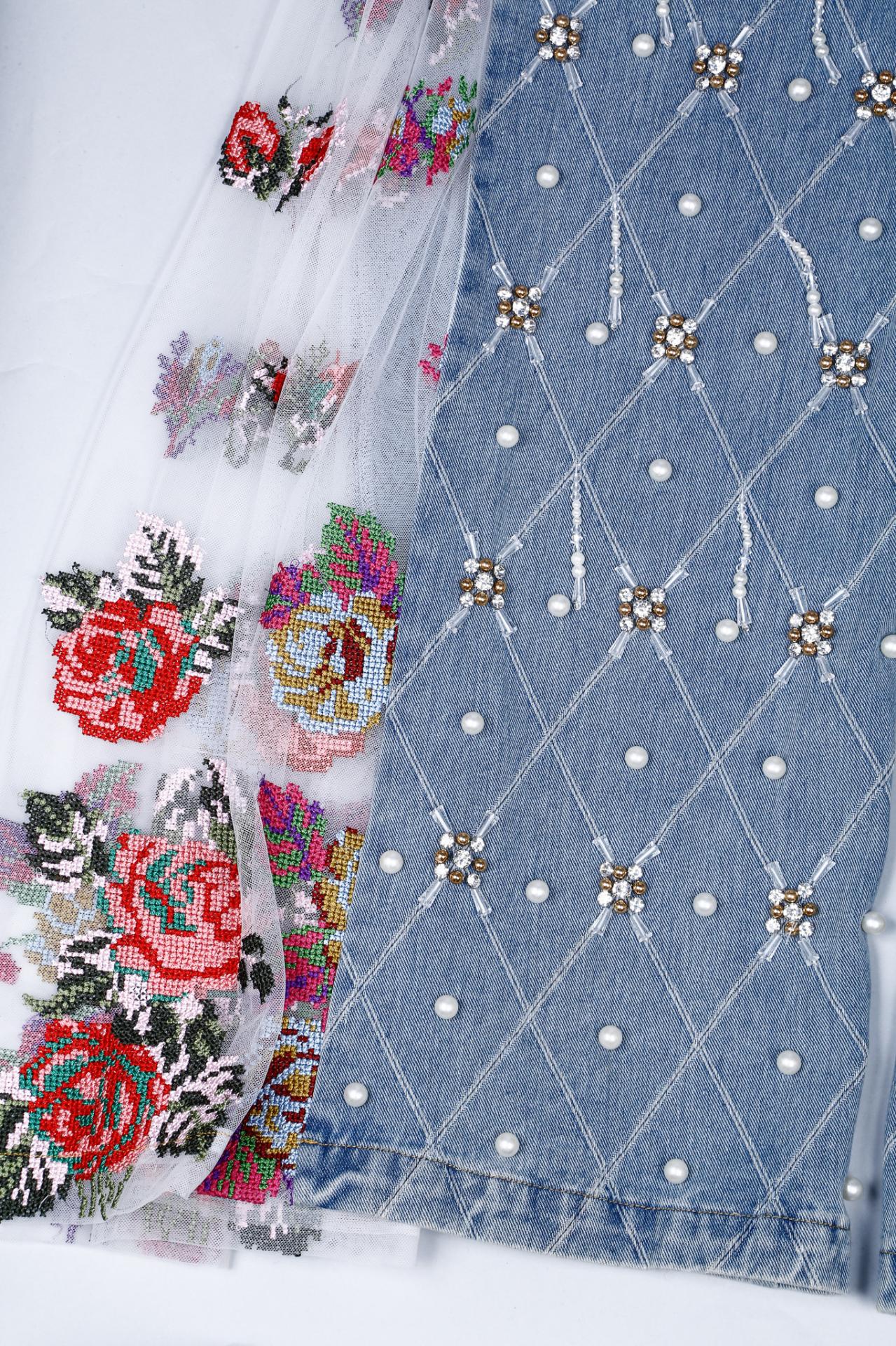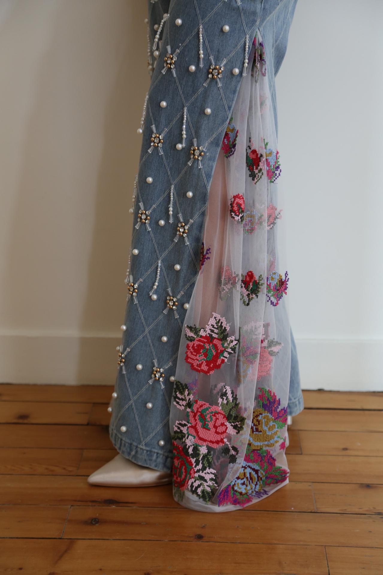 These Ornate Floral Jeans transform classic denim into a dreamy, poetic statement piece. Crafted in soft blue denim, the legs are embellished with an intricate lattice of embroidered pearls and golden threads, creating a refined, shimmering texture. Along the sides, fluid tulle drapes cascade gracefully, each panel adorned with blooming embroidered roses in soft pink and deep red tones. The effect is breathtaking, a fusion of denim ease and haute-couture delicacy.