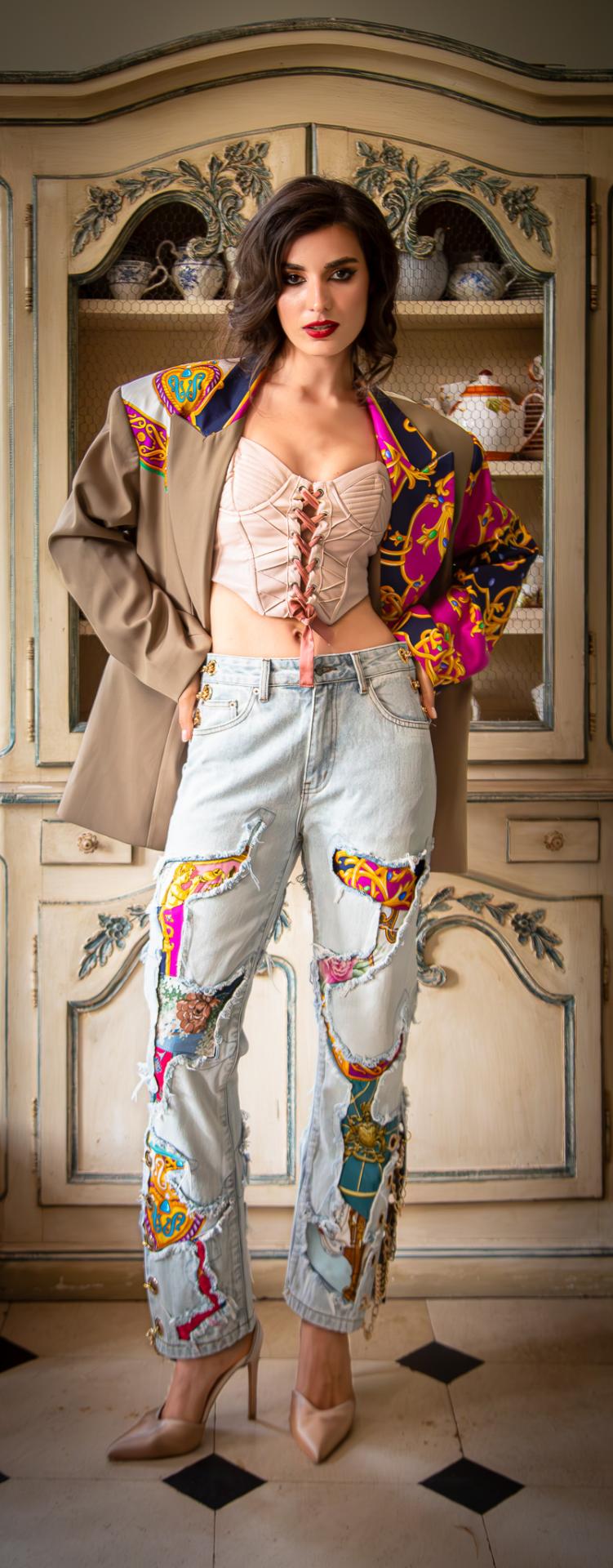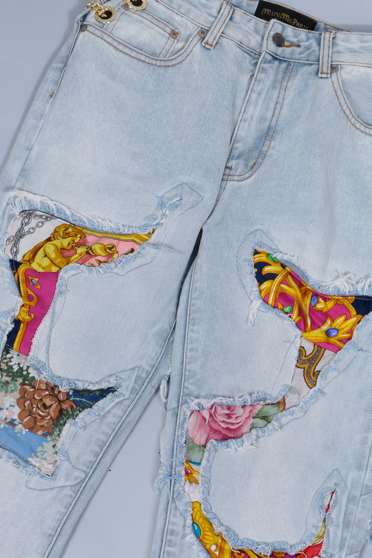 This light-wash denim is slashed open to reveal a curated tapestry of vintage silk scarves — baroque chains, cherubs, florals, and bold prints bursting through every rip like secret fragments of a forgotten wardrobe. Each patch is unique, like a memory sewn into denim.
