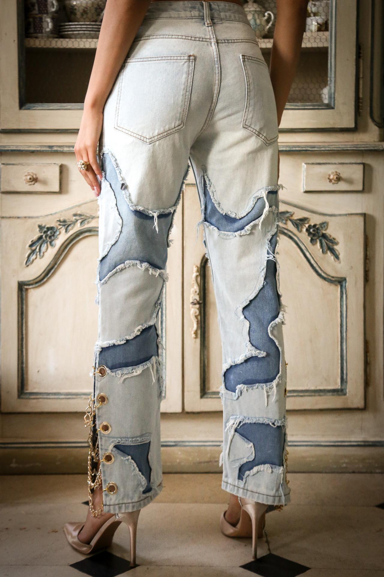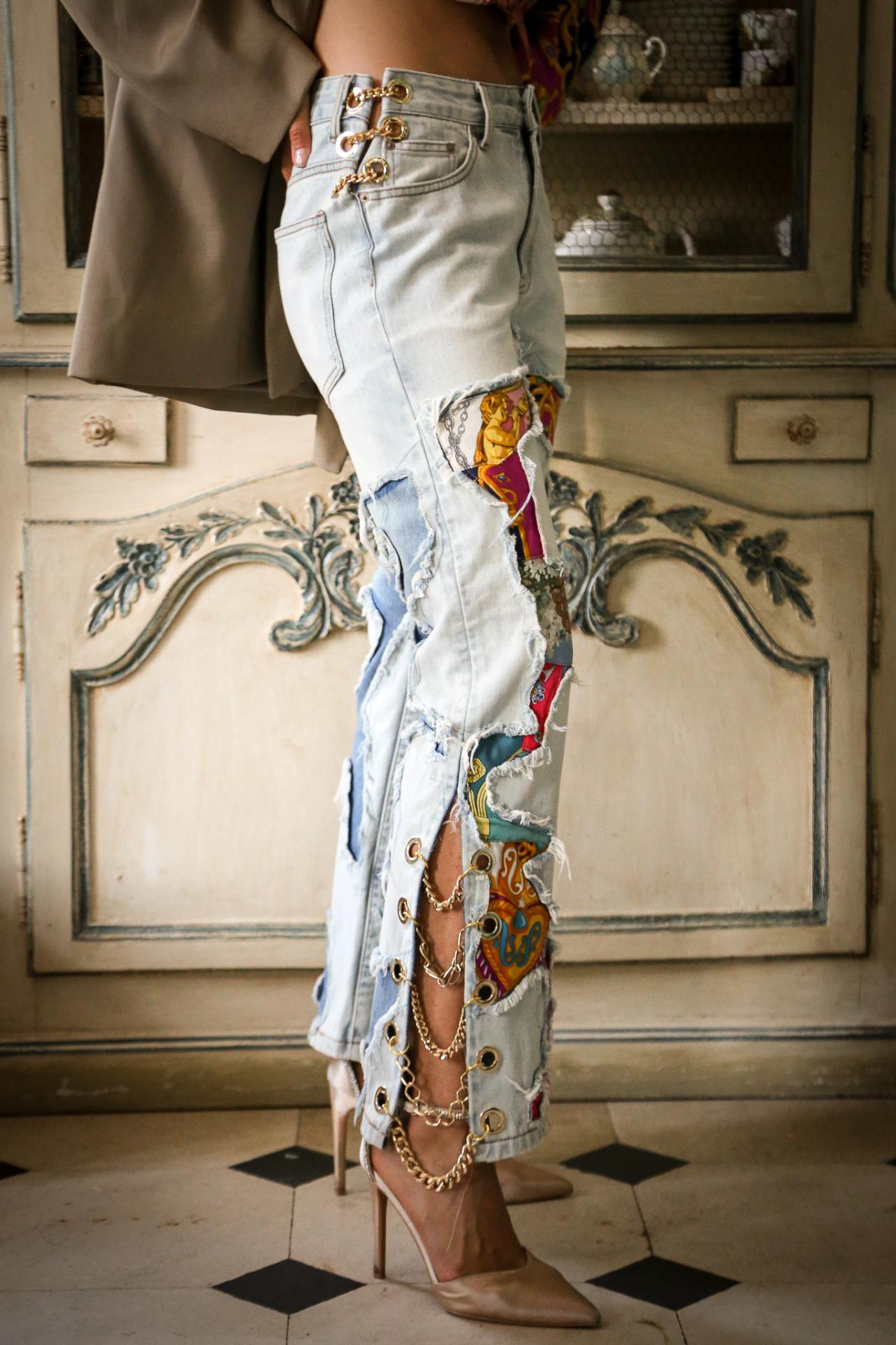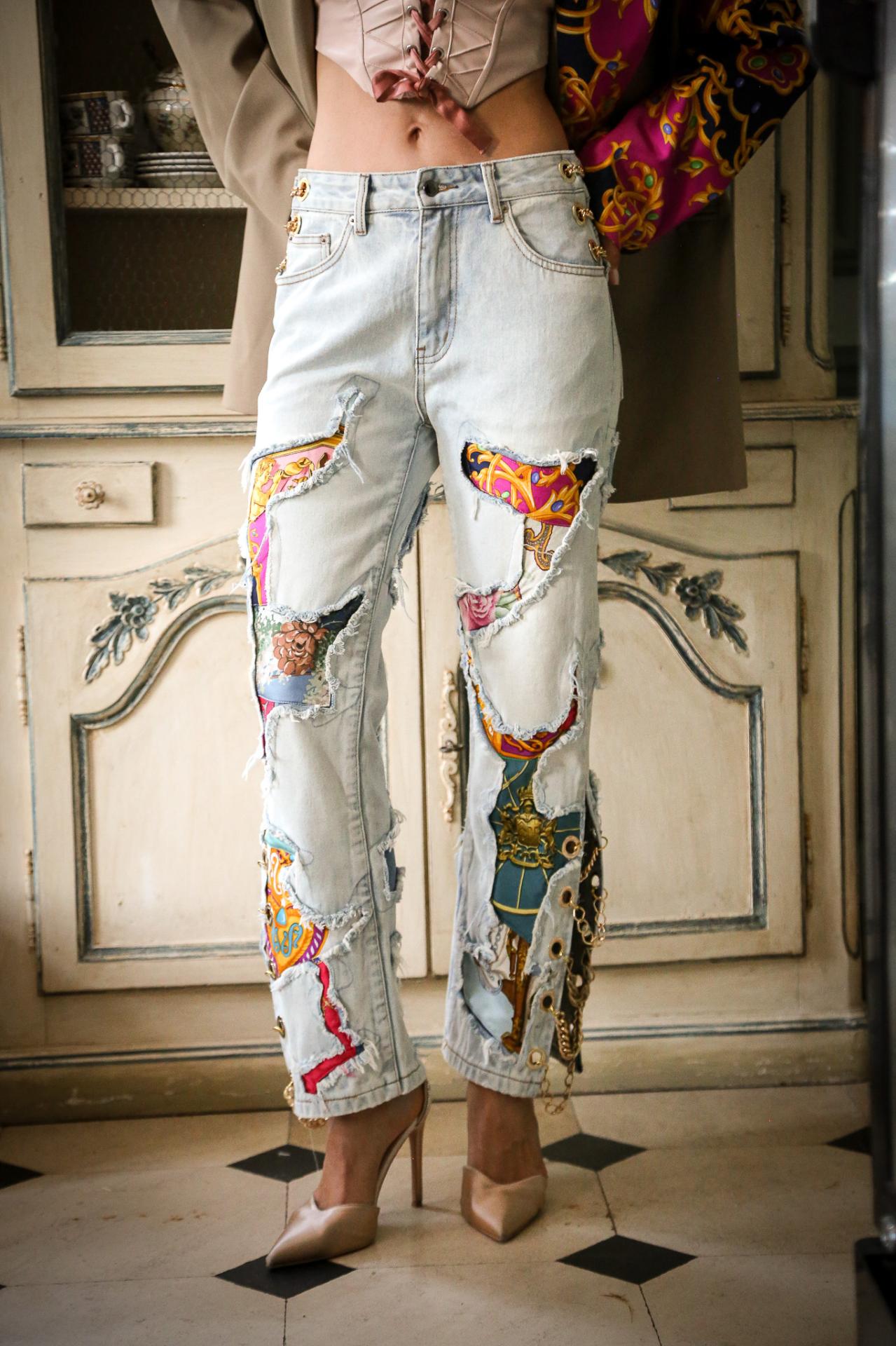 Where denim meets decadence, the Scarf-Patchwork Jeans weave luxury into rebellion.