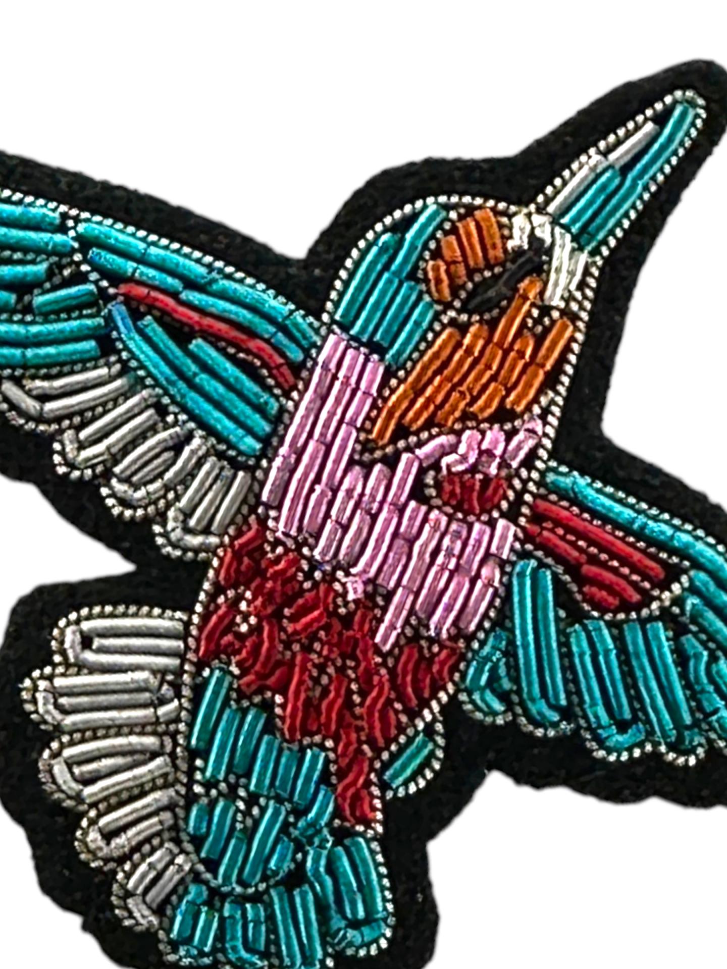 Intricately crafted with a combination of metallic threads, enamel, and rhinestones to create depth and texture