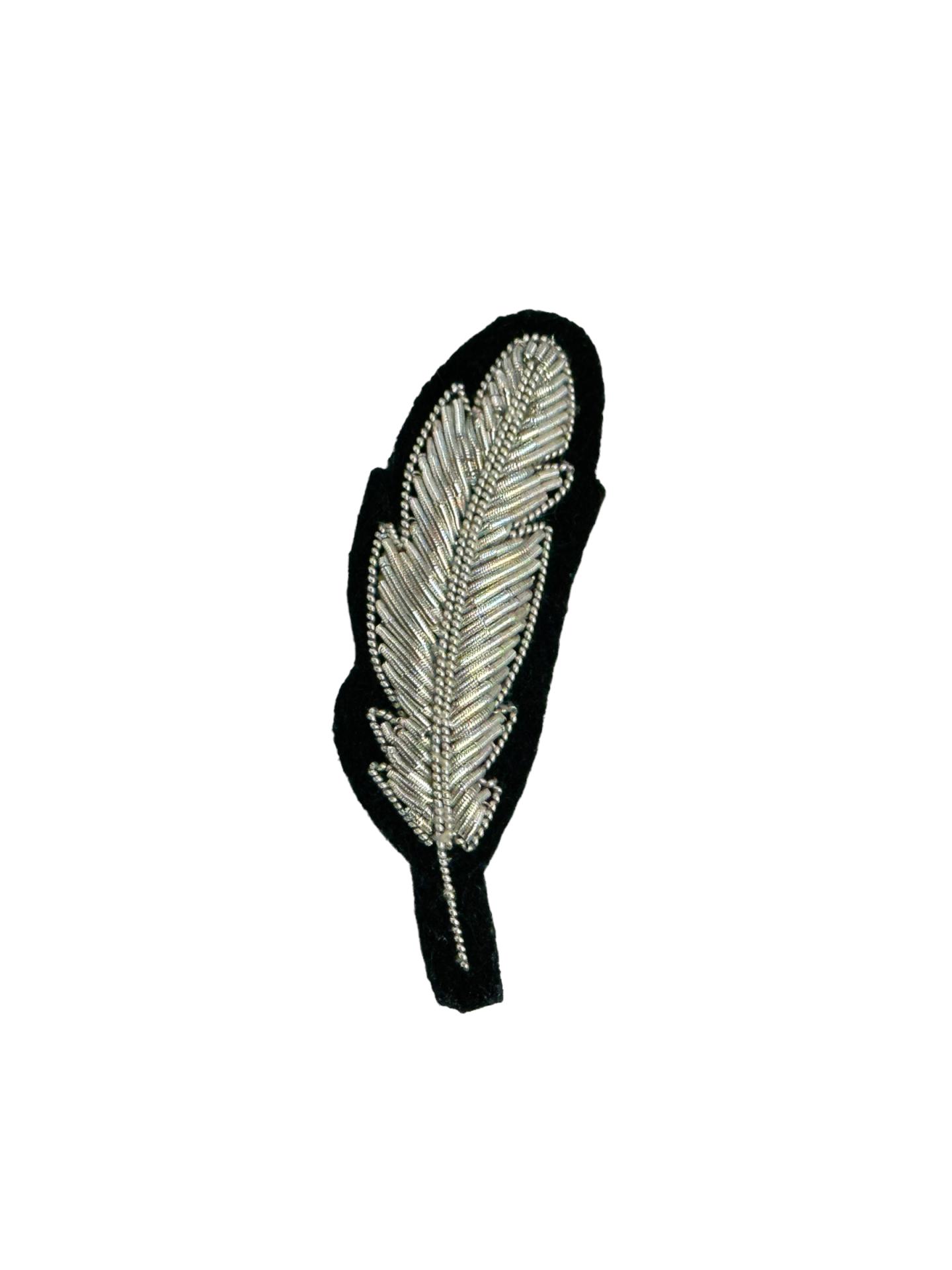 Hand-embroidered brooch in metallic cannetille thread, feather brooch