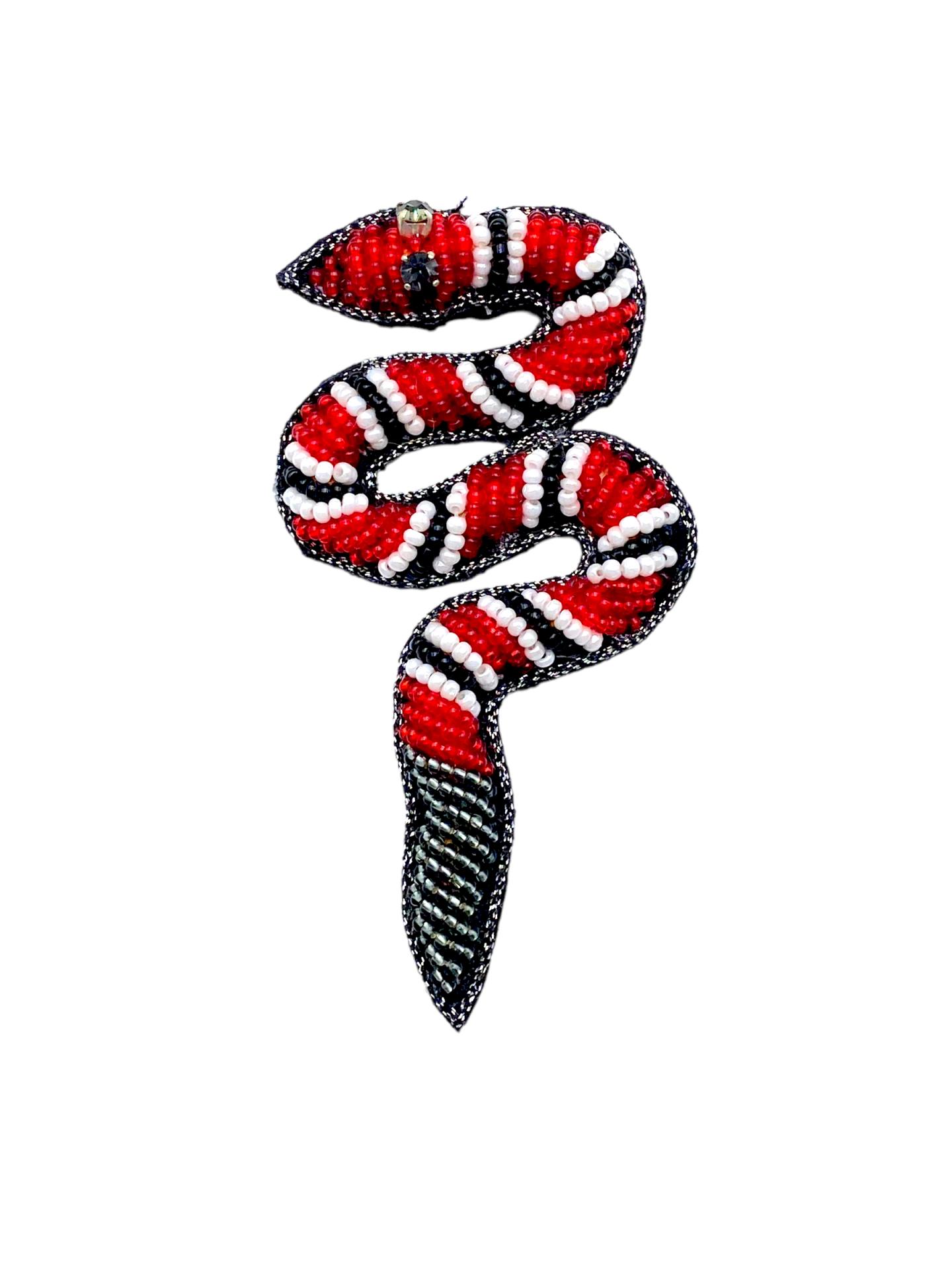 A stunning red snake design, crafted with intricate enamel work, highlighting the snake's sleek curves and dynamic form