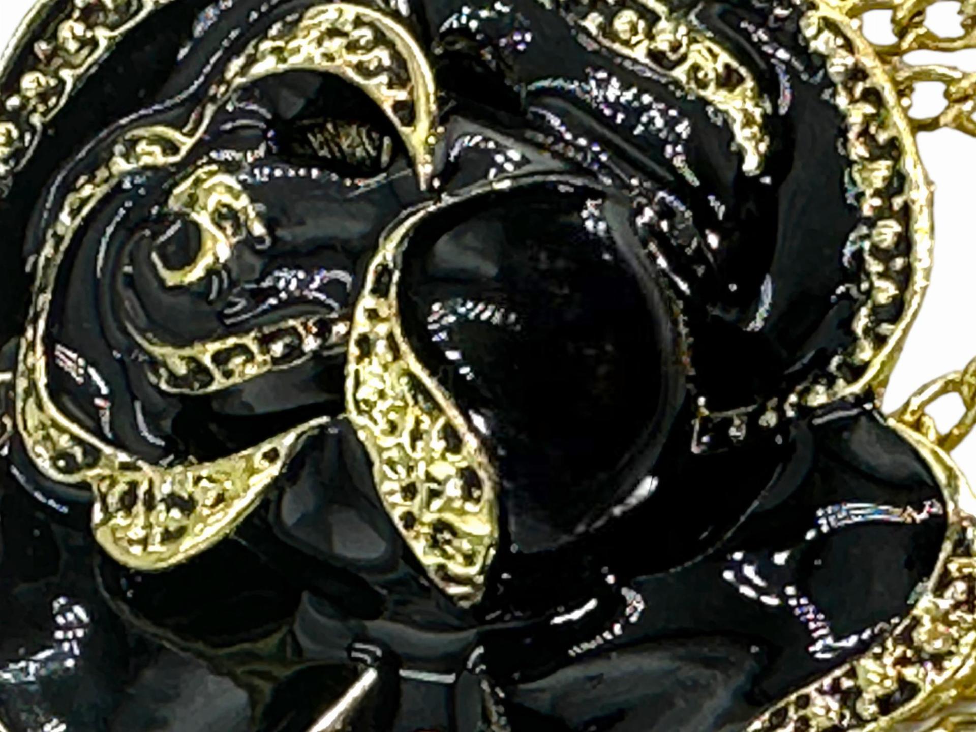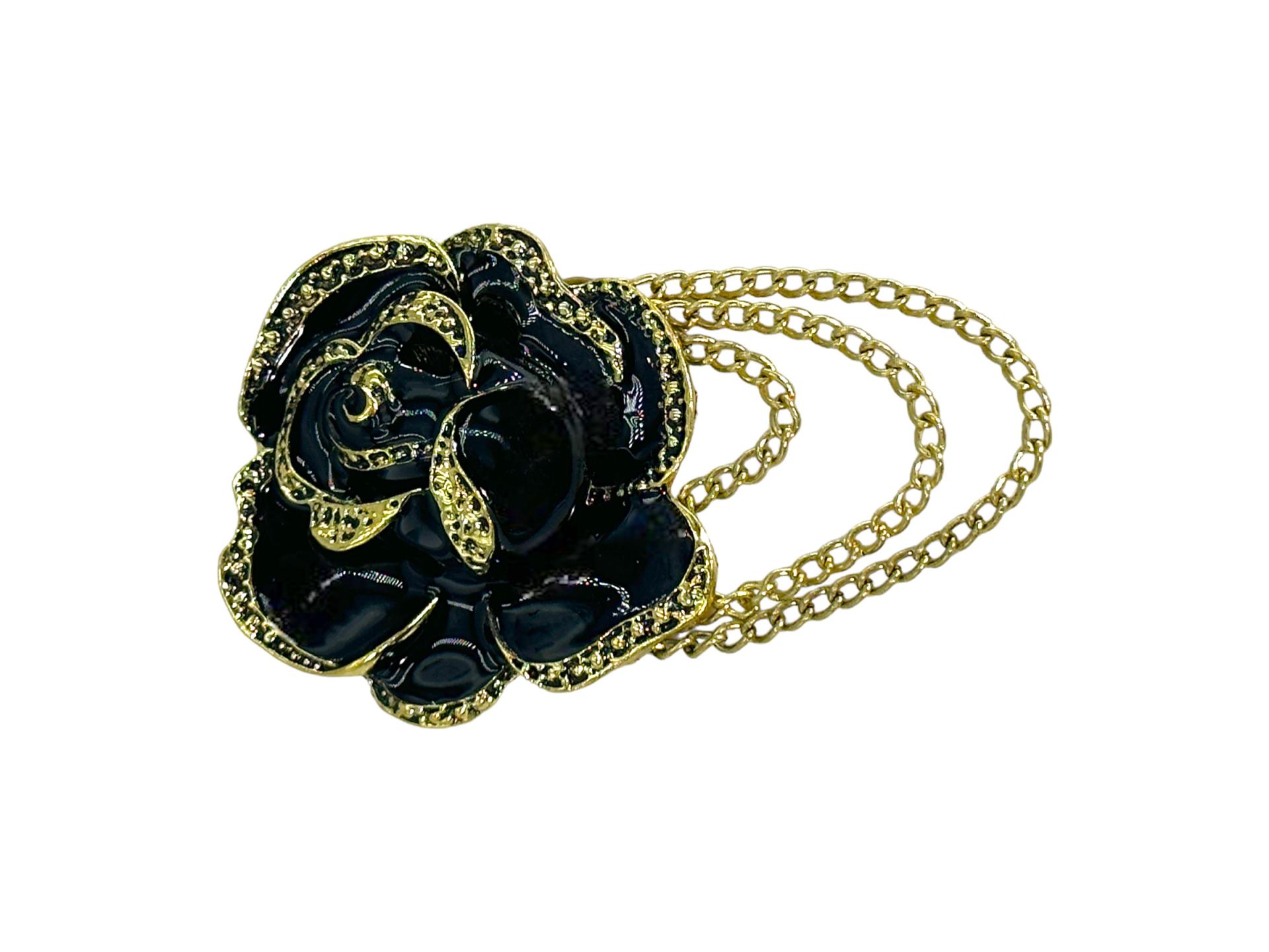 A striking twist on the classic floral brooch, the Black Flower Rock Brooch combines delicate design with a daring attitude. Crafted in gold-plated metal and finished with deep black enamel, this brooch features a bold flower accented with a draped chain detail that gives it a rebellious, rock-inspired flair.