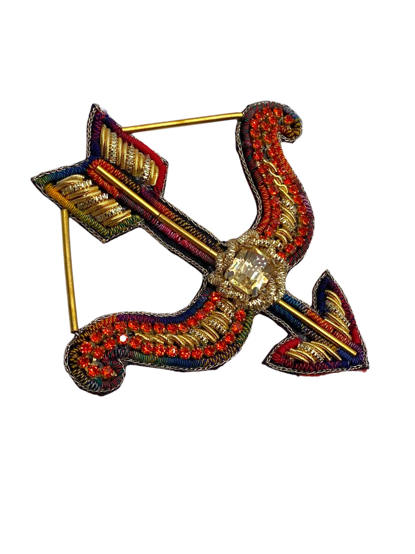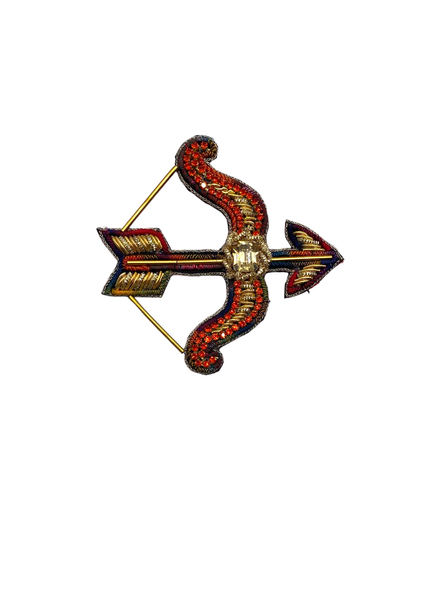 This Bow & Arrow Brooch is a dazzling tribute to charm and precision, designed to strike right at the heart. Crafted with metallic threads and bursting with zirconium stones, the brooch features a sculpted bow pulled back with a sparkling arrow, ready to fire. A mix of romance and fierceness, this piece is as symbolic as it is stylish.