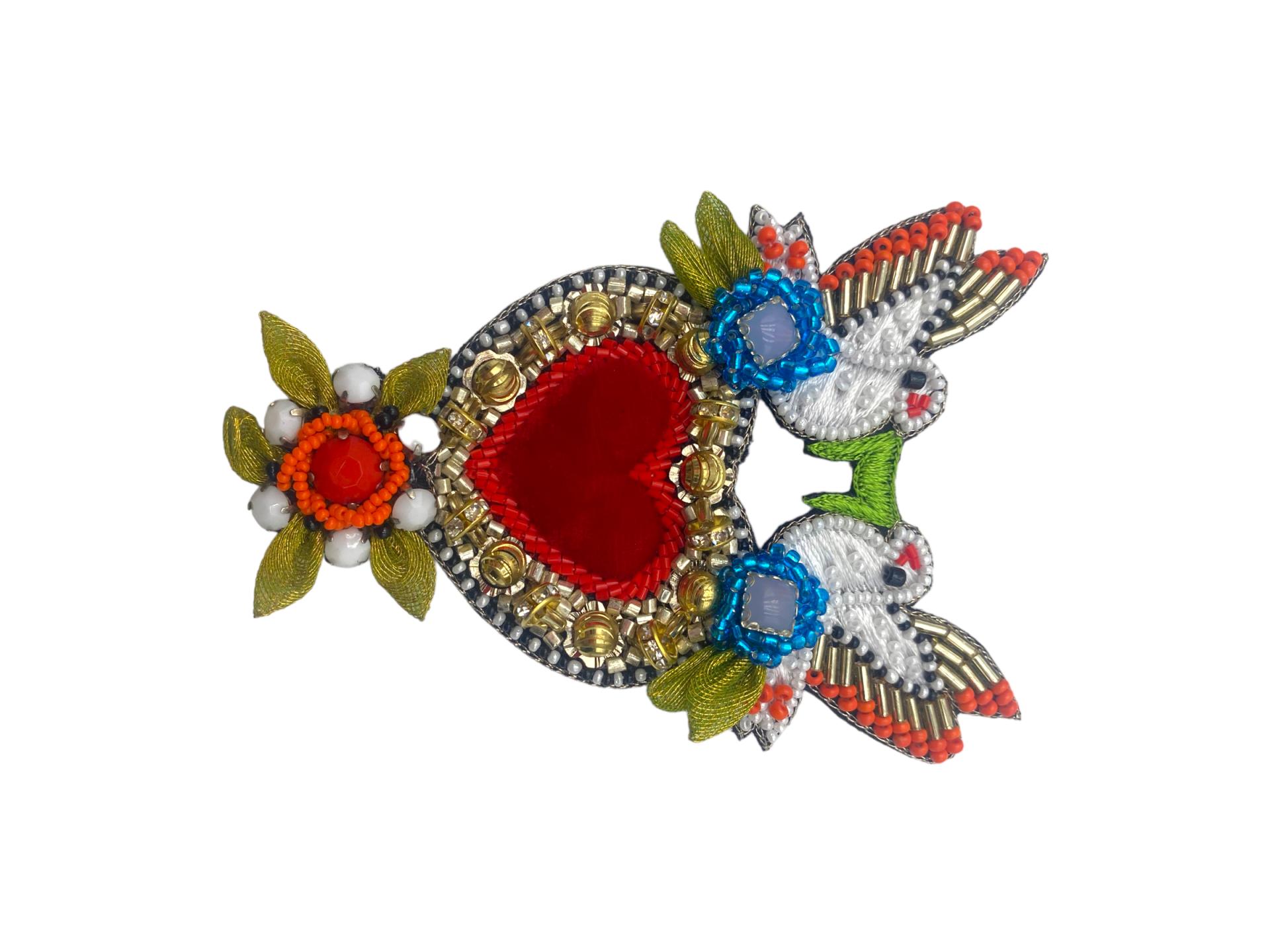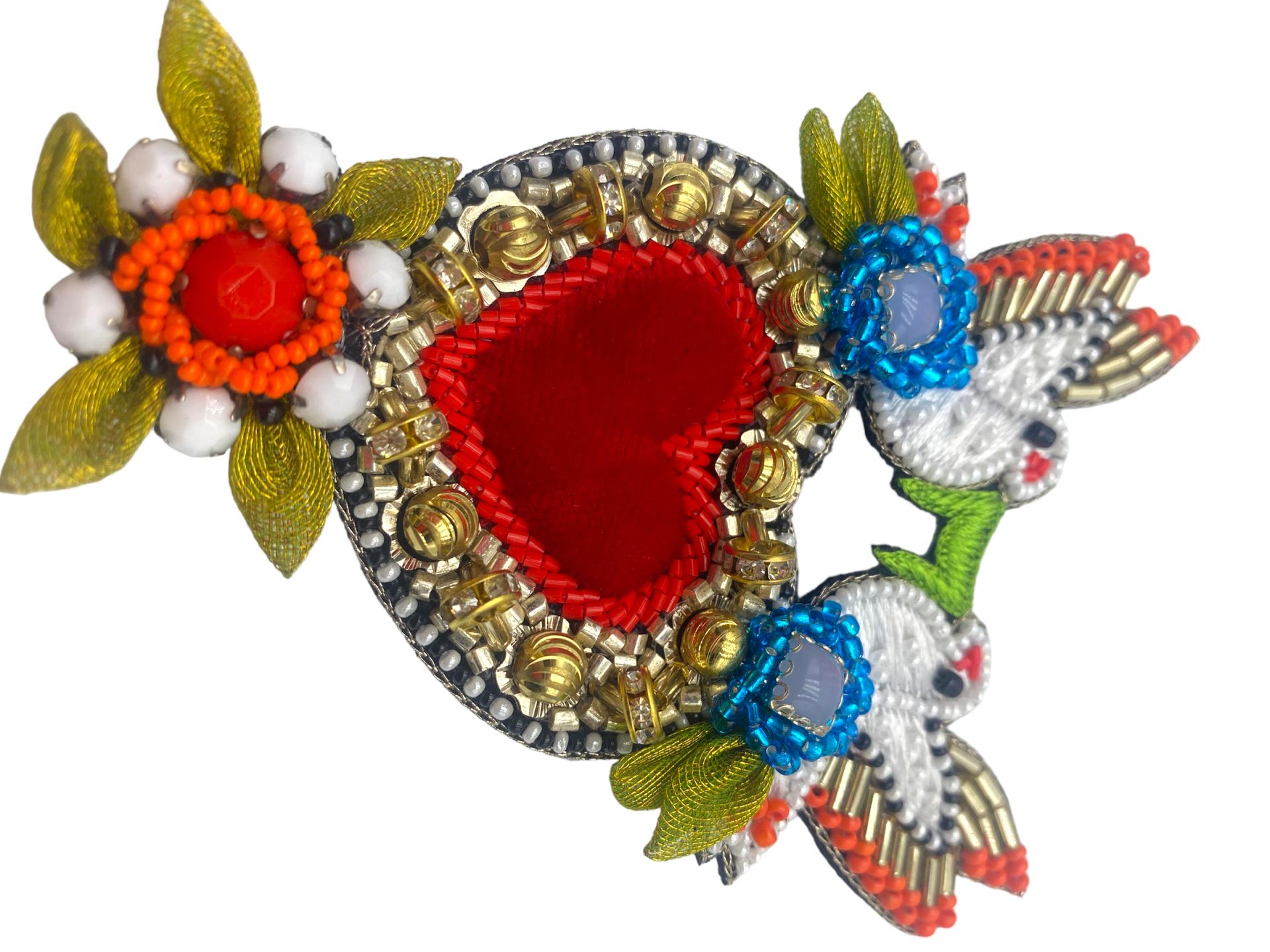 Infused with emotion and artisanal beauty, this Hand-Embroidered Love Heart Brooch is a true statement of passion and drama. Bursting with vibrant colors, shimmering pearls, gold metal and ornate fancy stones, it’s a wearable piece of art that radiates romance and bold expression.