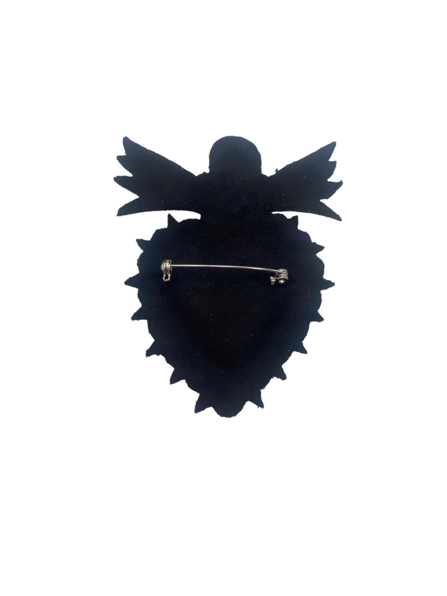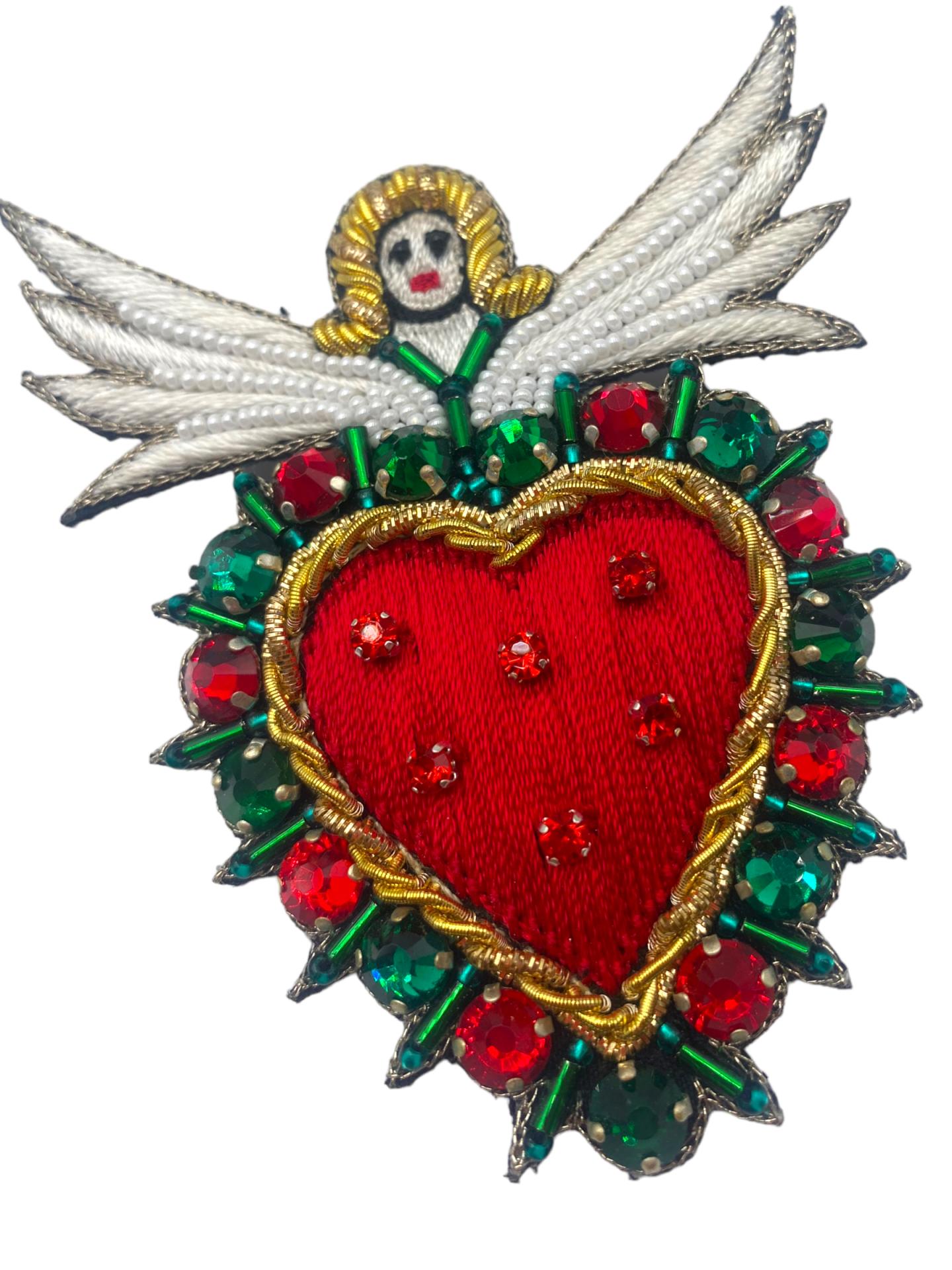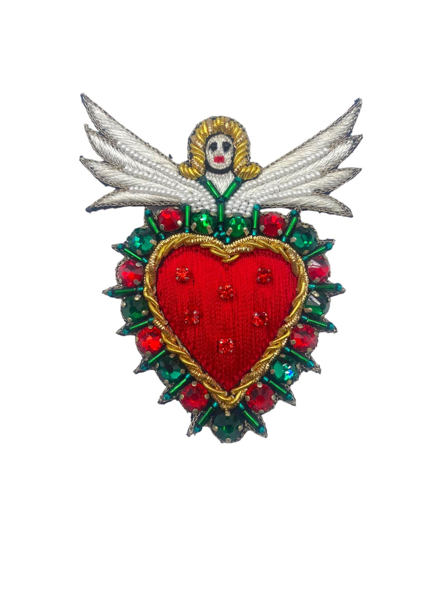 The Protective Heart Embroidered Brooch with Angel is a beautifully crafted piece that blends elegance with deep symbolism. Featuring an angel cradling a red and green heart, this brooch represents love, protection, and guidance. The intricate embroidery work, combined with the vibrant colors, makes this piece a striking addition to any collection.