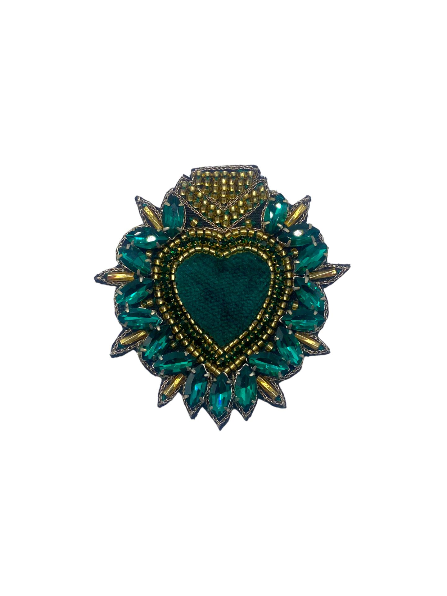 The Embroidered Sacred Heart Brooch is a stunning fusion of sacred symbolism and artistic craftsmanship. The bold design, adorned in rich turquoise and gold, brings a divine energy and timeless beauty to your accessories collection. This brooch radiates elegance and reverence, perfect for adding a sacred touch of sophistication to any outfit.