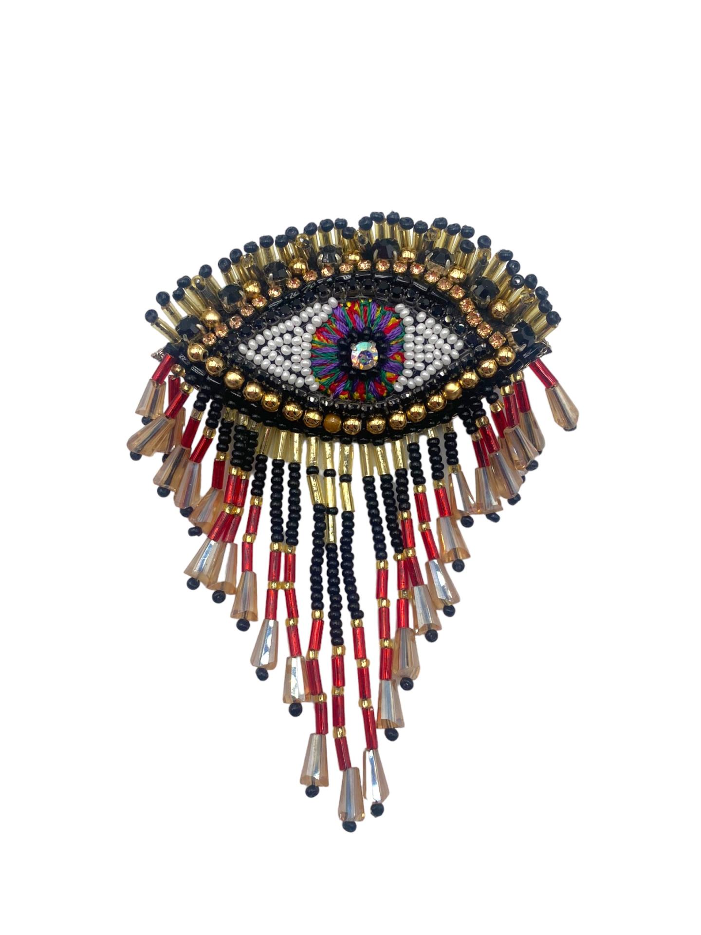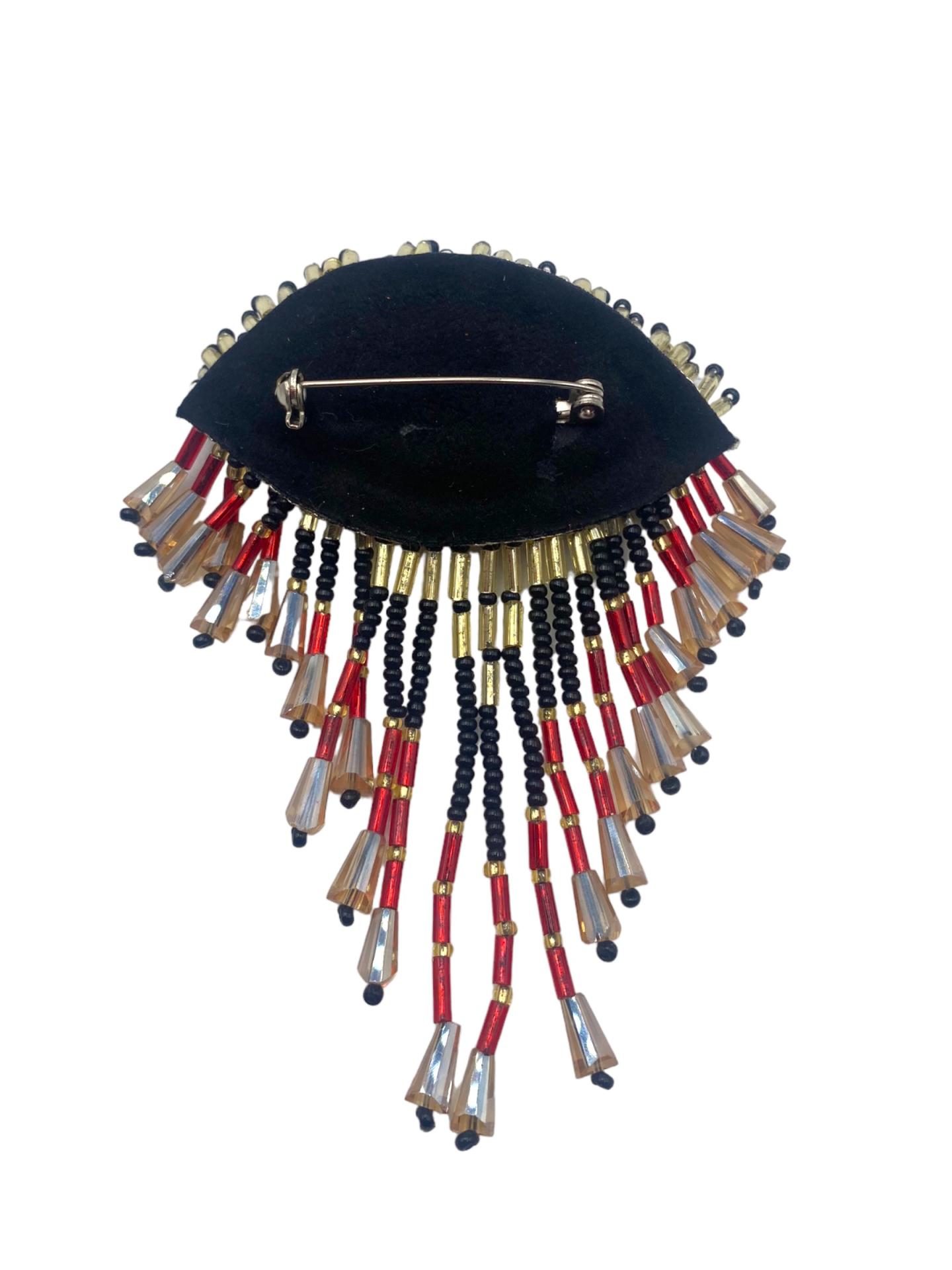 Adding further elegance and movement, multiple strands of beaded threads cascade gracefully from the lower edge of the eye, creating a sense of flow and fluidity. These delicate dangling elements enhance the brooch’s overall drama, making it a statement accessory that commands presence.Key Features: