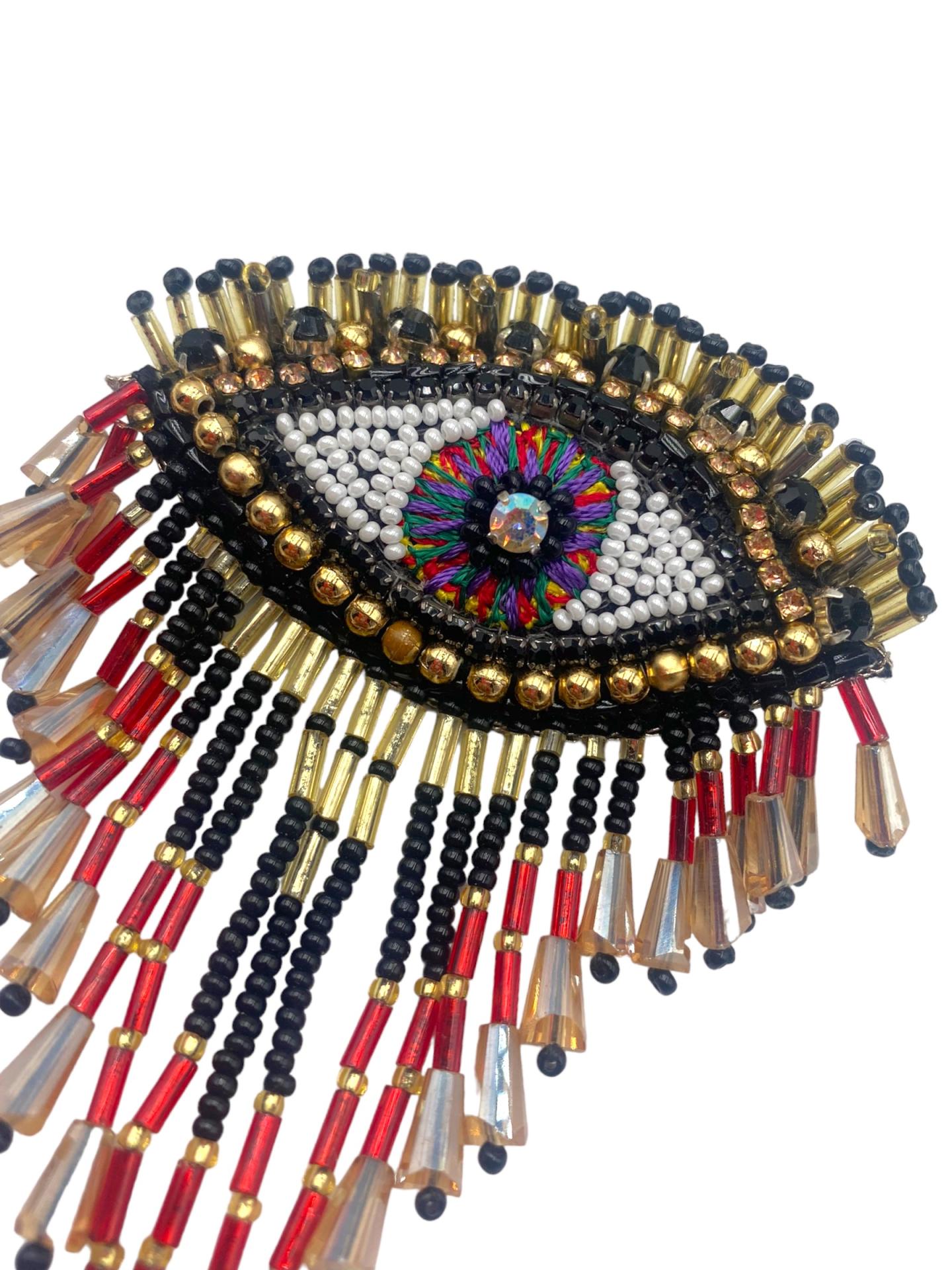 Mystical, artistic, and unapologetically bold—the Embroidered Beaded Eye Brooch is a powerful symbol of protection and intuition transformed into an intricate piece of wearable art. At the center of this mesmerizing brooch lies a radiant multicolor embroidered eye, brought to life with rich hues and detailed stitching. The heart of the eye features a brilliant crystal, catching the light and drawing all attention to its luminous gaze.