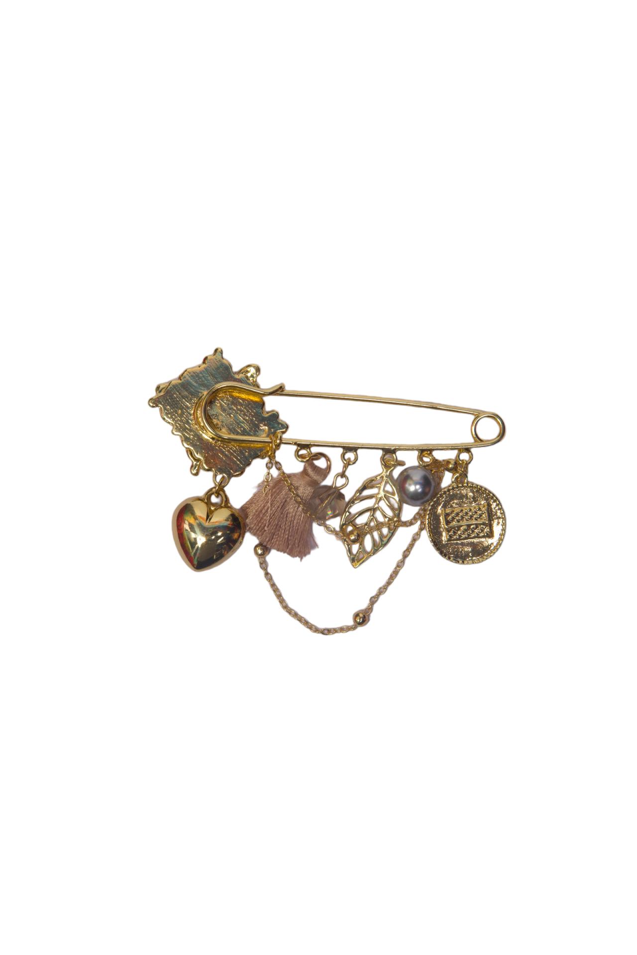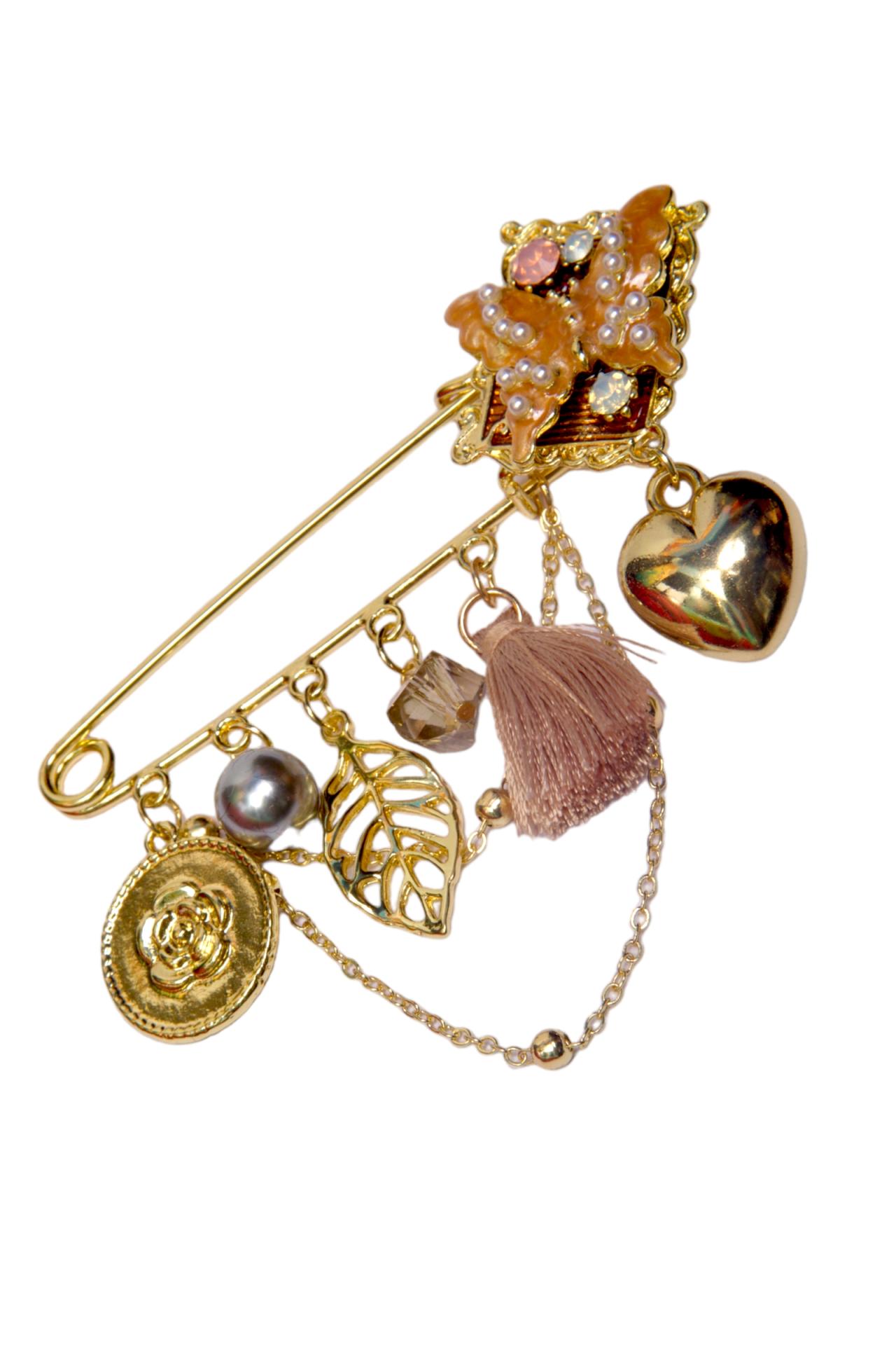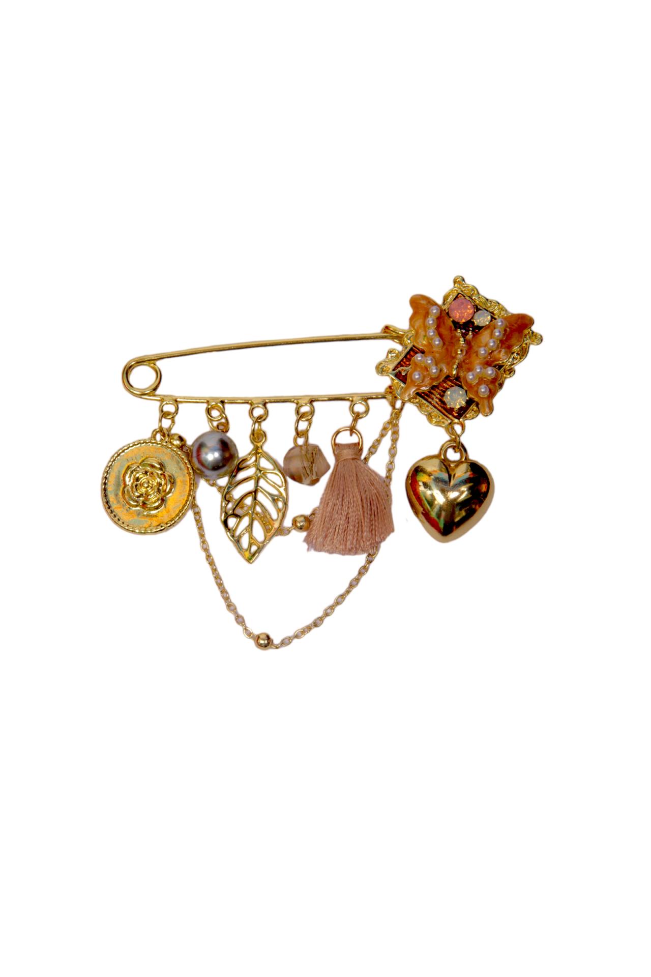A Whimsical and Elegant Floral Design. The Butterfly Pin Brooch is a beautifully crafted accessory that exudes elegance and charm. Featuring a delicate combination of intricate butterflies, hearts, leaves, and pearls, this brooch tells a story of nature's beauty and love. The gold metal adds a touch of sophistication, while the pearls bring a soft, luxurious feel. Perfect for those who love feminine, nature-inspired designs with a hint of romance, this brooch adds a whimsical and graceful touch to any outfit.