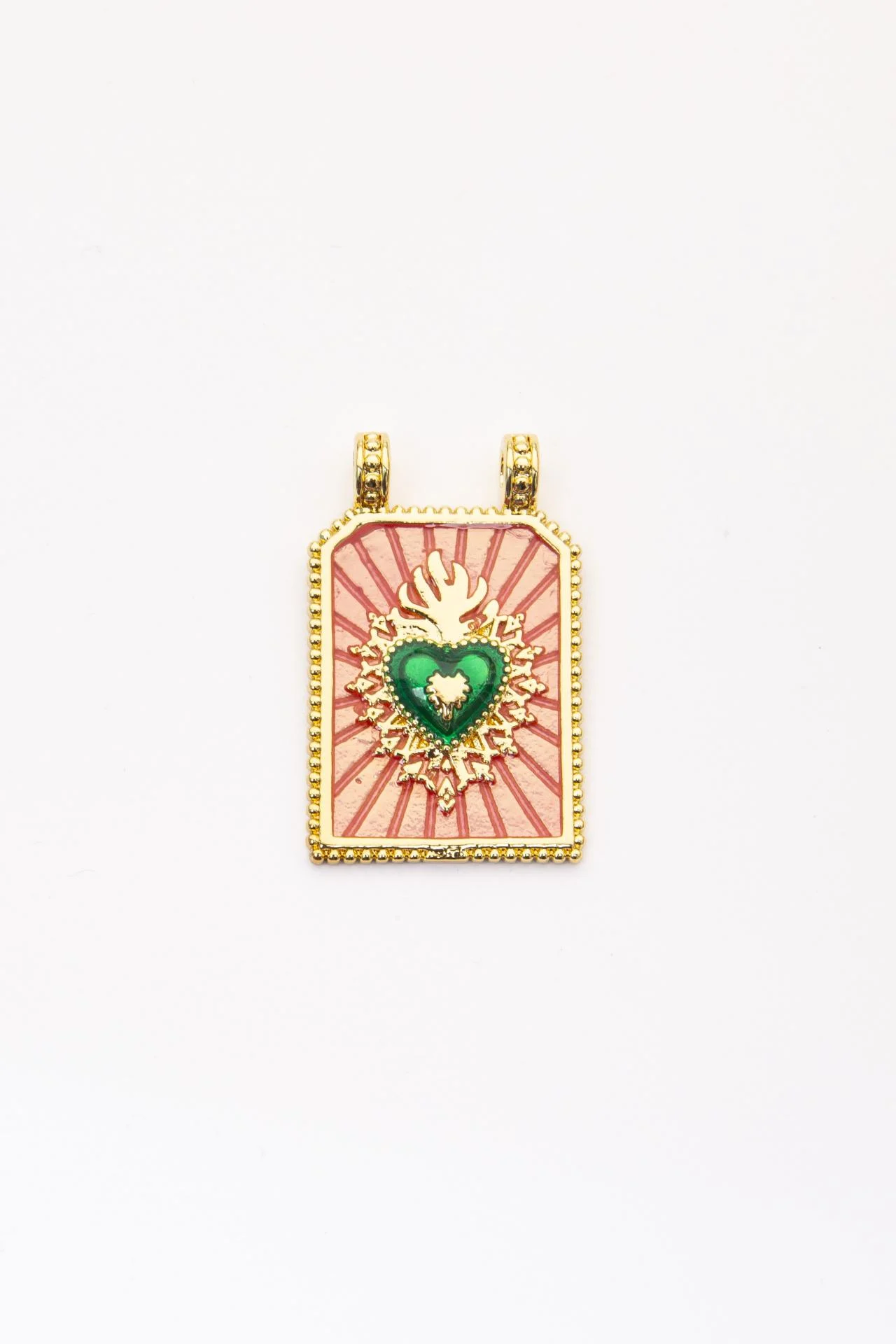 The Sacred Heart Radiance Charm is a stunning blend of passion, faith, and artistry. Set against a soft rose enamel background with golden rays, this arched rectangular charm features a raised green heart with a delicate gold heart at its center—symbolizing layered love and divine light. Framed with pavé rhinestones and dual loops for a balanced drape, it’s the perfect centerpiece for spiritual, symbolic, or love-themed charm jewelry.