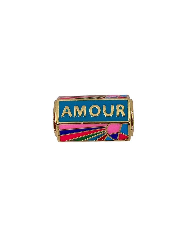 "Amour" beautifully crafted in gold metal with colorful blue and pink accents