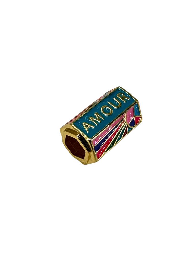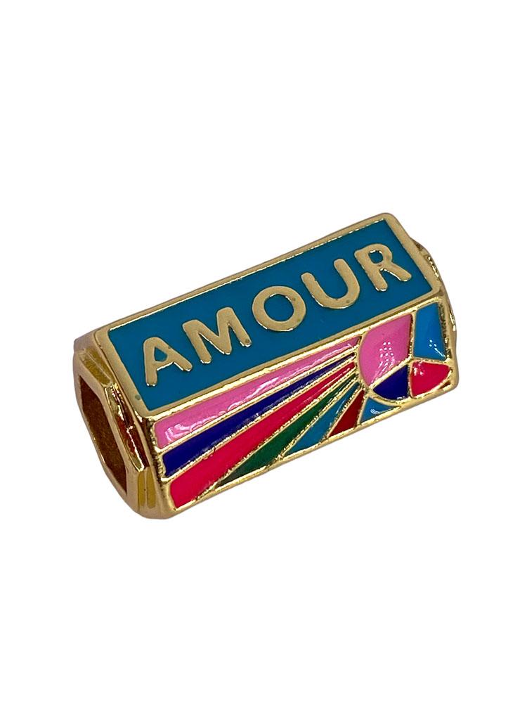 Express your love and passion with the Amour Charm in Gold with Blue and Pink. This beautiful charm features the word "Amour" elegantly crafted in gold metal, adorned with vibrant blue and pink accents that give it a playful and romantic touch. Whether you're gifting it to someone special or wearing it as a personal reminder, this charm radiates love, joy, and charm.