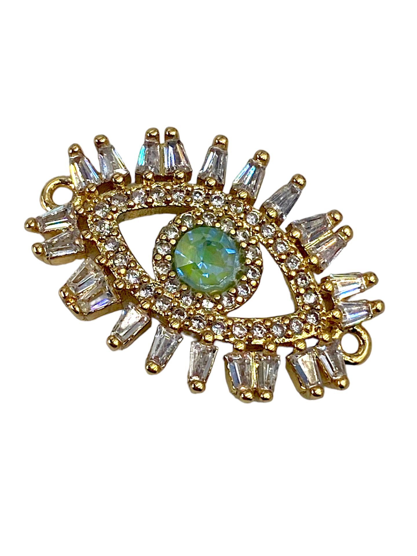 Gold-plated metal pendant with rhinestone eyelashes and jade-colored eye
