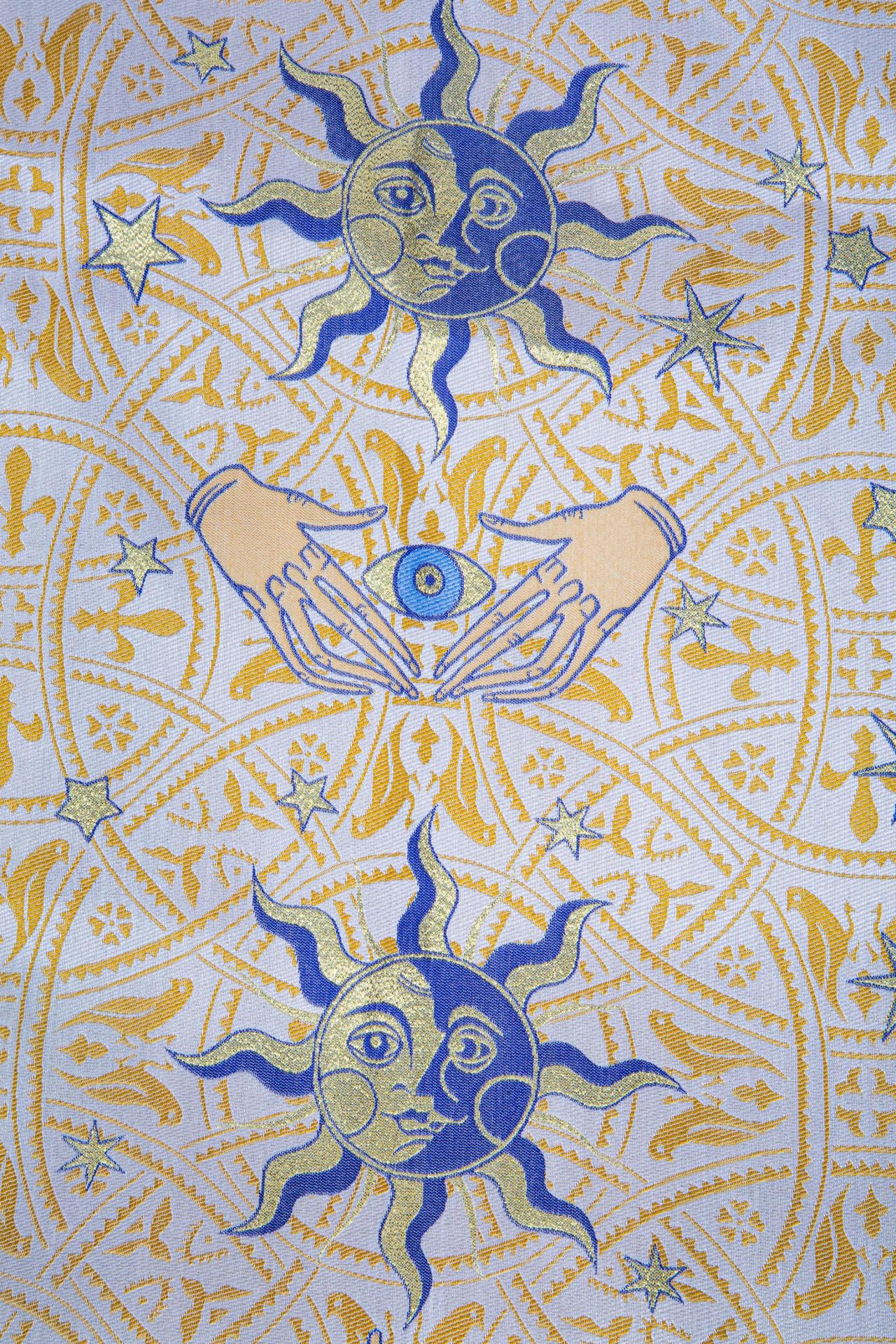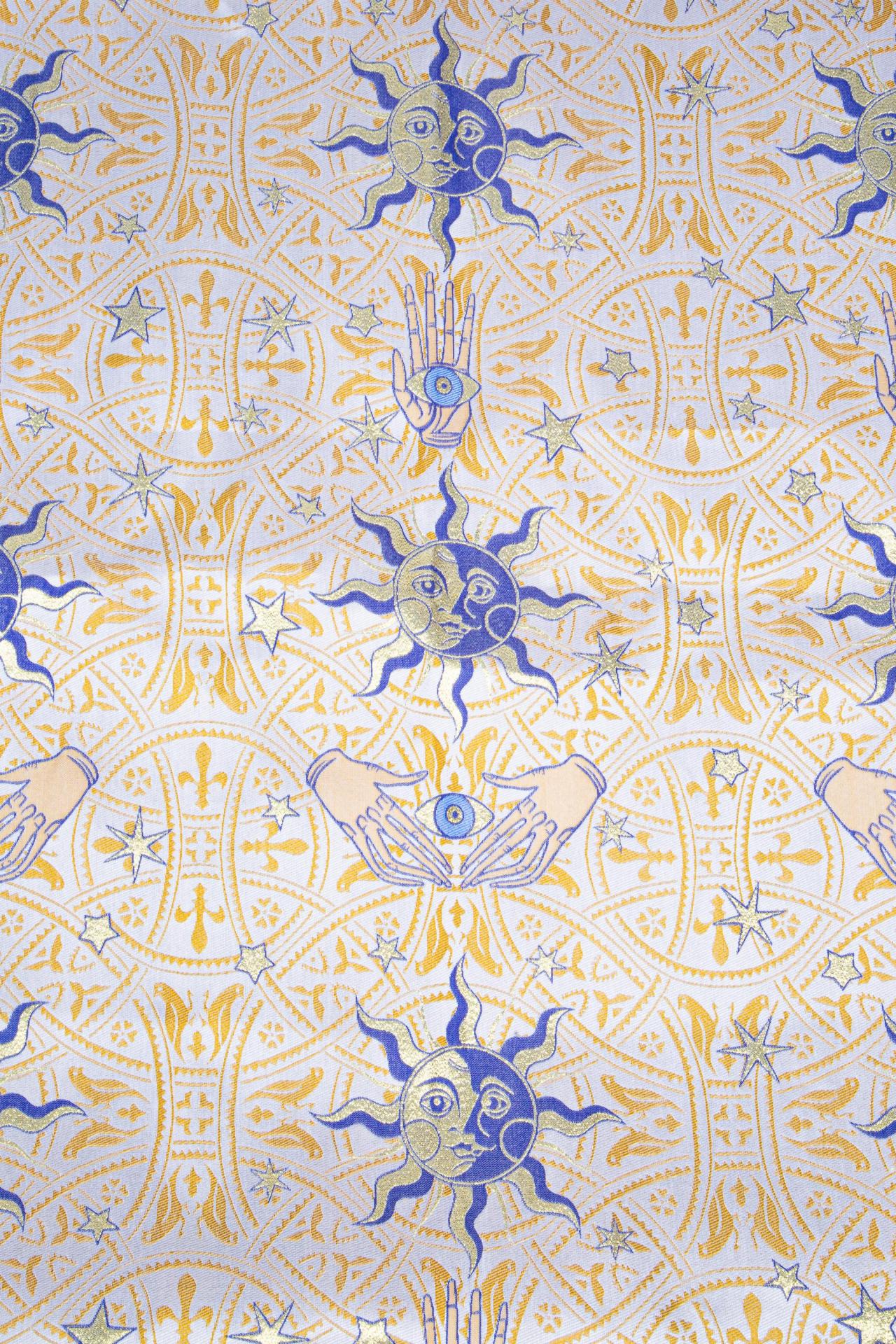 Ornate Fabric Featuring Sunbursts, Stars, and Compass Motifs in Soft Gold and Blue