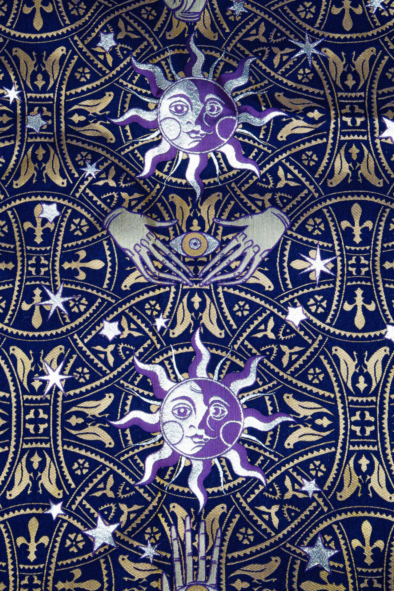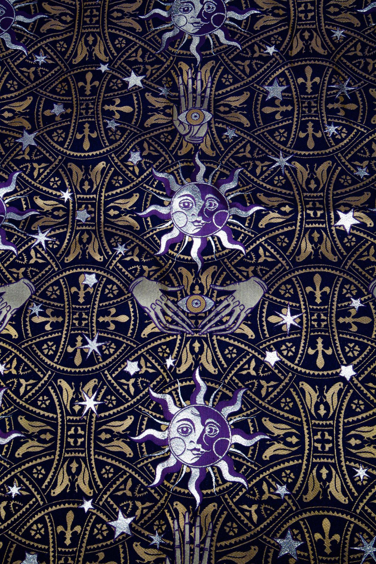 The Midnight Zodiac Tapestry Fabric is a cosmic fusion of mysticism and gothic elegance. Featuring radiant suns and moons with expressive faces, open palms, and esoteric symbols set against a midnight backdrop, this fabric invites mystery and magic into every thread. Rich gold, ivory, and lilac accents make the pattern glow like constellations across a velvet sky.