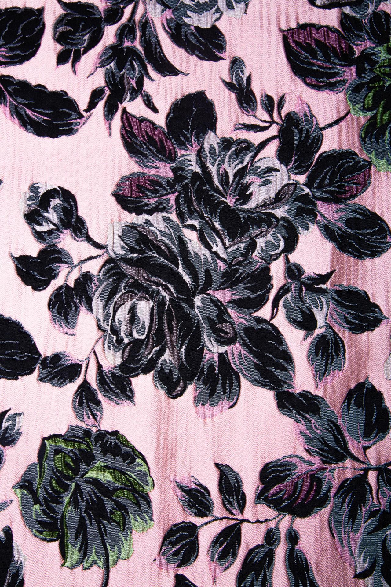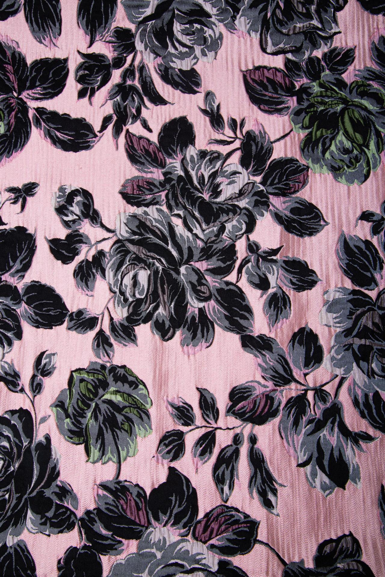 Pink Base Fabric with Black Flocked Roses and Deep Green Leaves