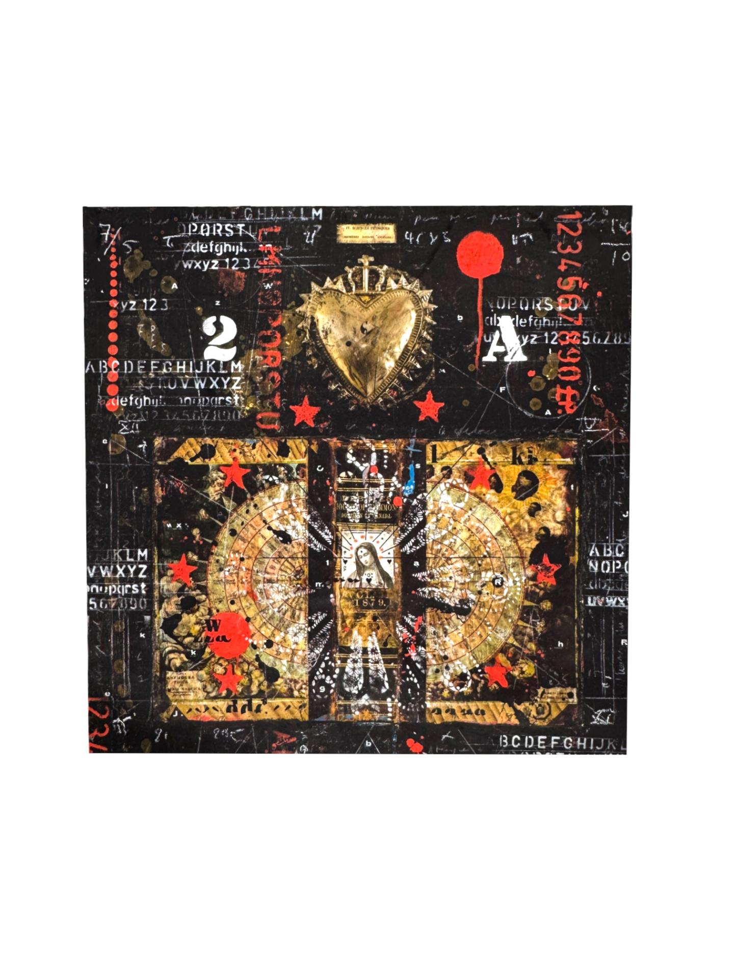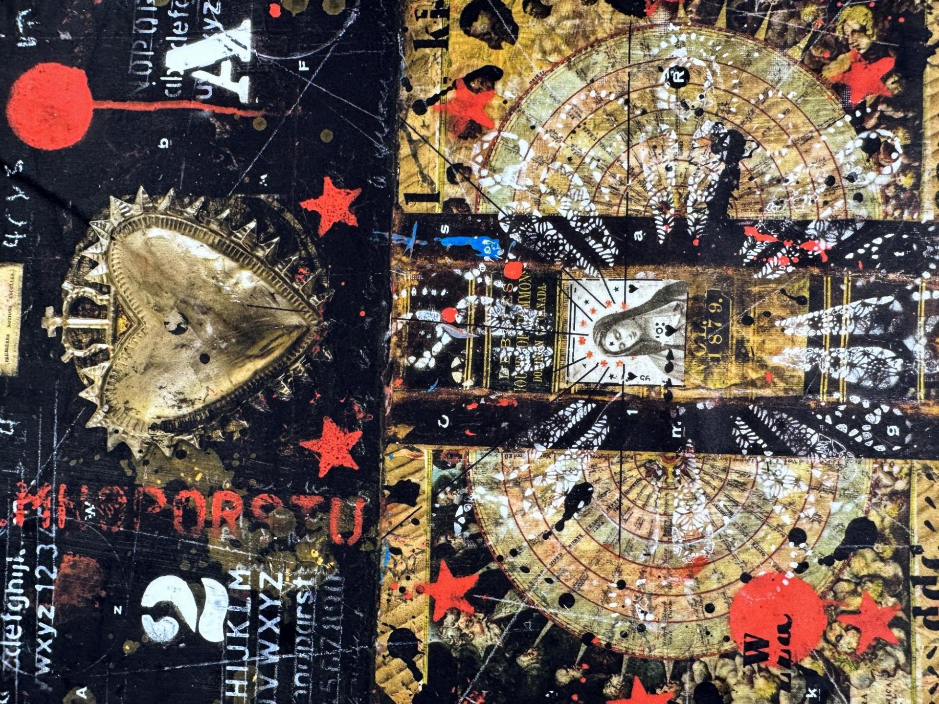 Rich collage of gothic arches, religious icons, hearts, and layered text