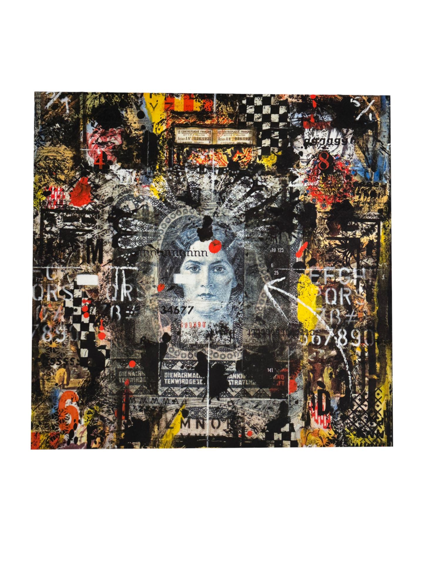 Collage-Style Fabric Featuring a Feminine Icon Surrounded by Street Art and Protest Graphics