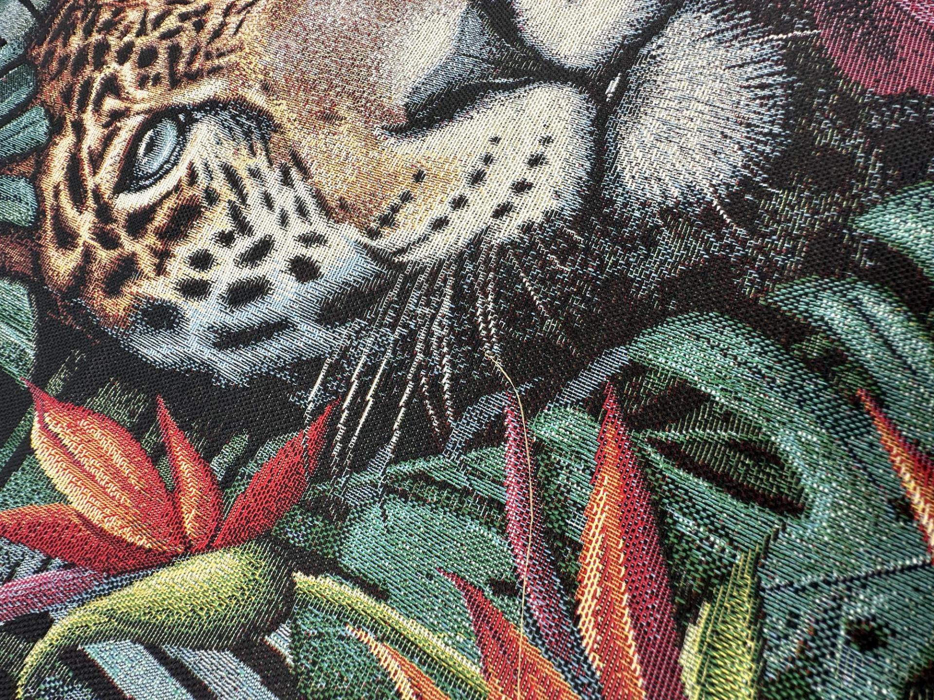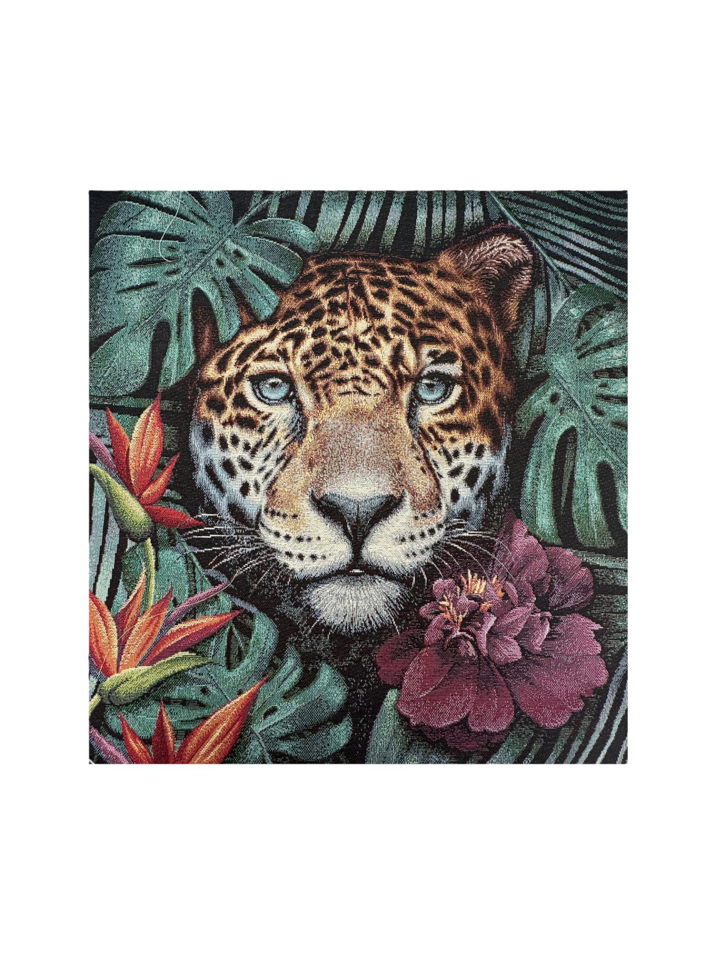The Jungle Majesty Tapestry Fabric captures the fierce serenity of the wild. A striking leopard gazes forward from a lush canopy of monstera leaves, lilies, and exotic blooms, rendered in rich, painterly detail. This piece blends realism with drama, offering a bold, nature-inspired statement full of intensity and grace.