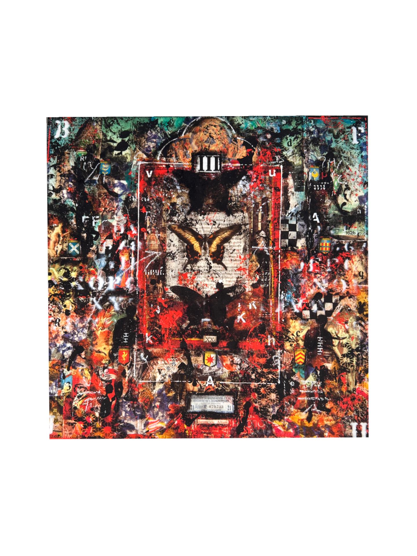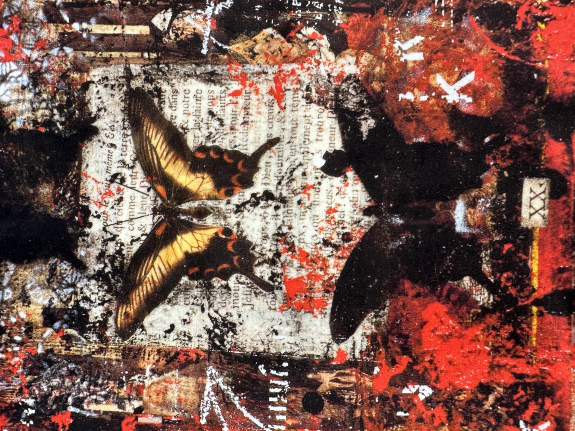 Mixed-Media Tapestry Fabric Featuring a Central Butterfly, Graffiti Layers, and Urban Collage Elements