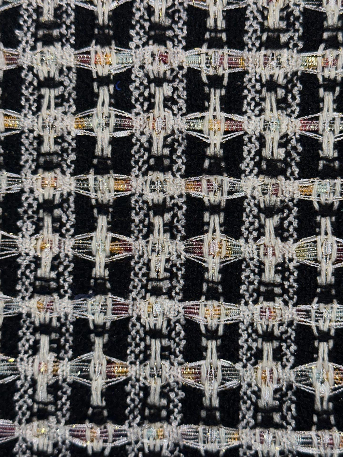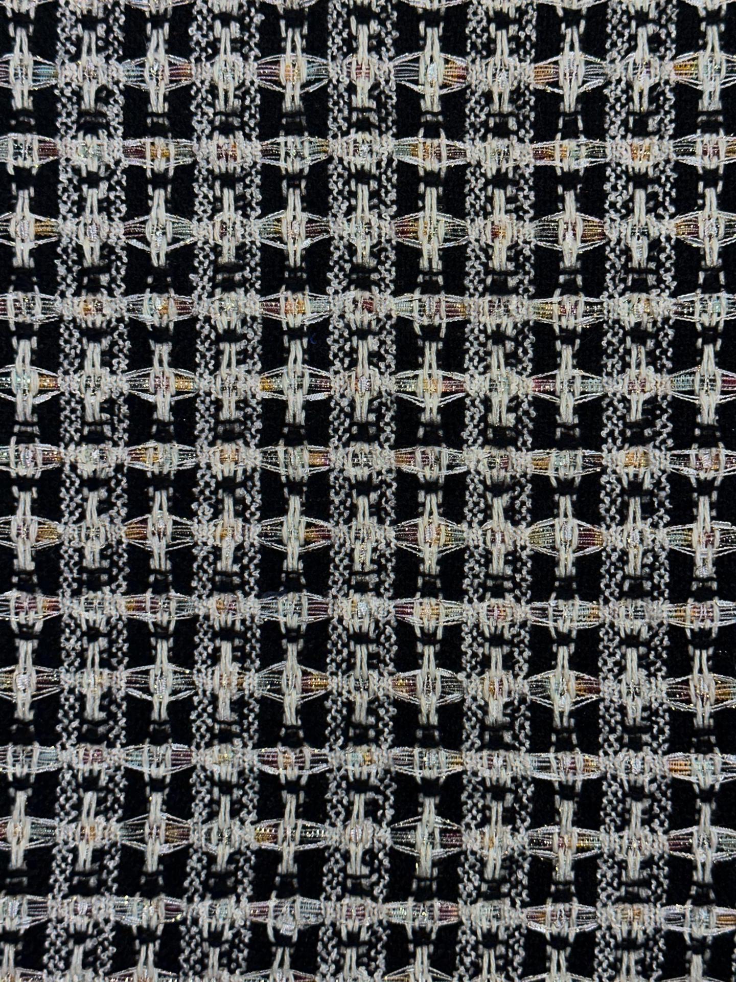 The Galaxy Grid Tweed Fabric is a standout blend of structure and shimmer. Featuring a deep black base with a bold geometric weave of metallic ivory and multicolored iridescent threads, this fabric reflects light in all the right ways. The grid-like pattern is sharp and dimensional—ideal for statement tailoring with a modern, edgy twist.