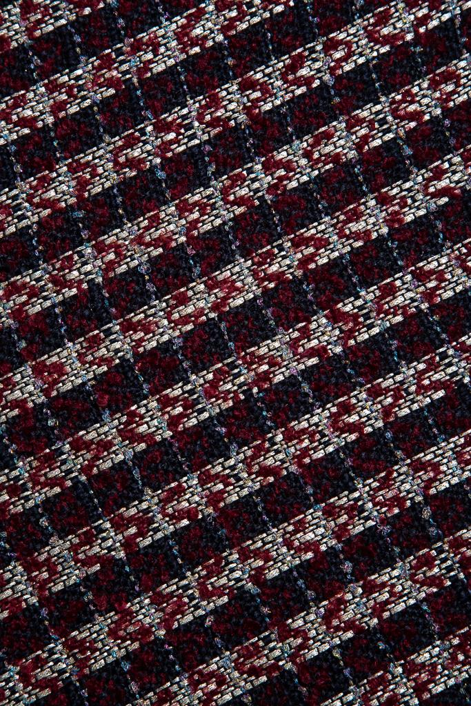 Make a bold statement with the Crimson Tweed Fabric, a luxurious blend of deep burgundy tones, rich blacks, and subtle metallic threads woven into a textured check pattern. Perfect for fall and winter collections, this fabric balances heritage structure with high-fashion flair—ideal for garments and accessories that command attention.
