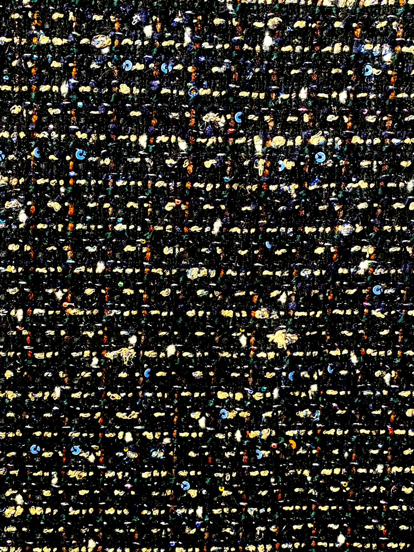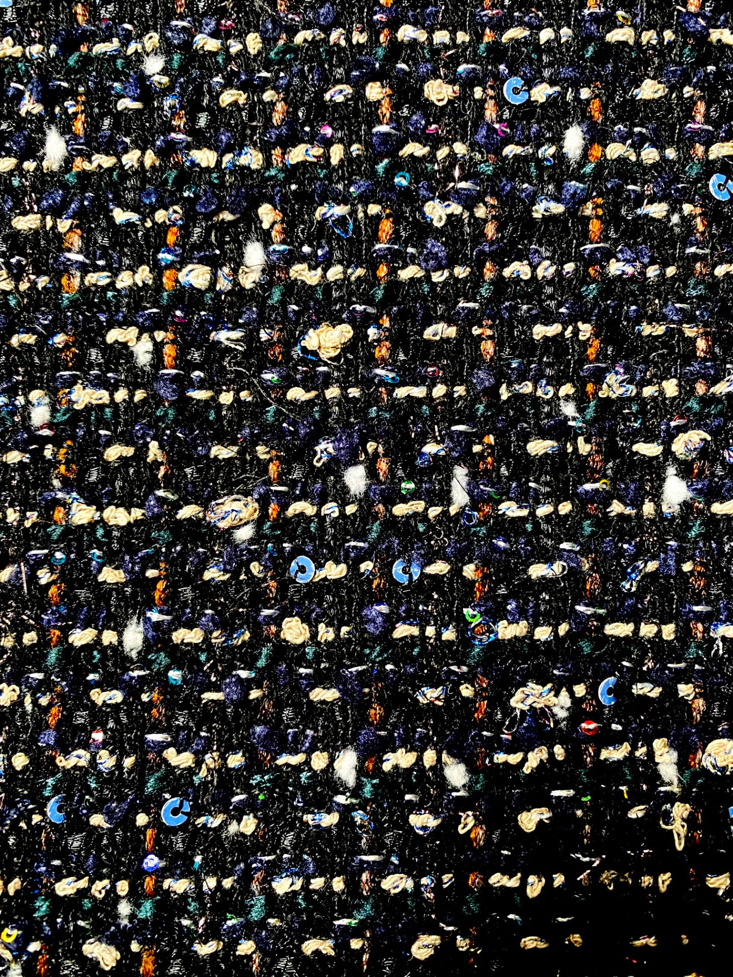 The Midnight Carnival Tweed Fabric is where classic elegance meets playful opulence. Woven on a deep black base, this fabric is brought to life with flecks of vivid colors—turquoise, gold, orange, and violet—and punctuated by tiny iridescent sequins that catch the light like confetti at dusk. Ideal for standout pieces that balance structure with sparkle.