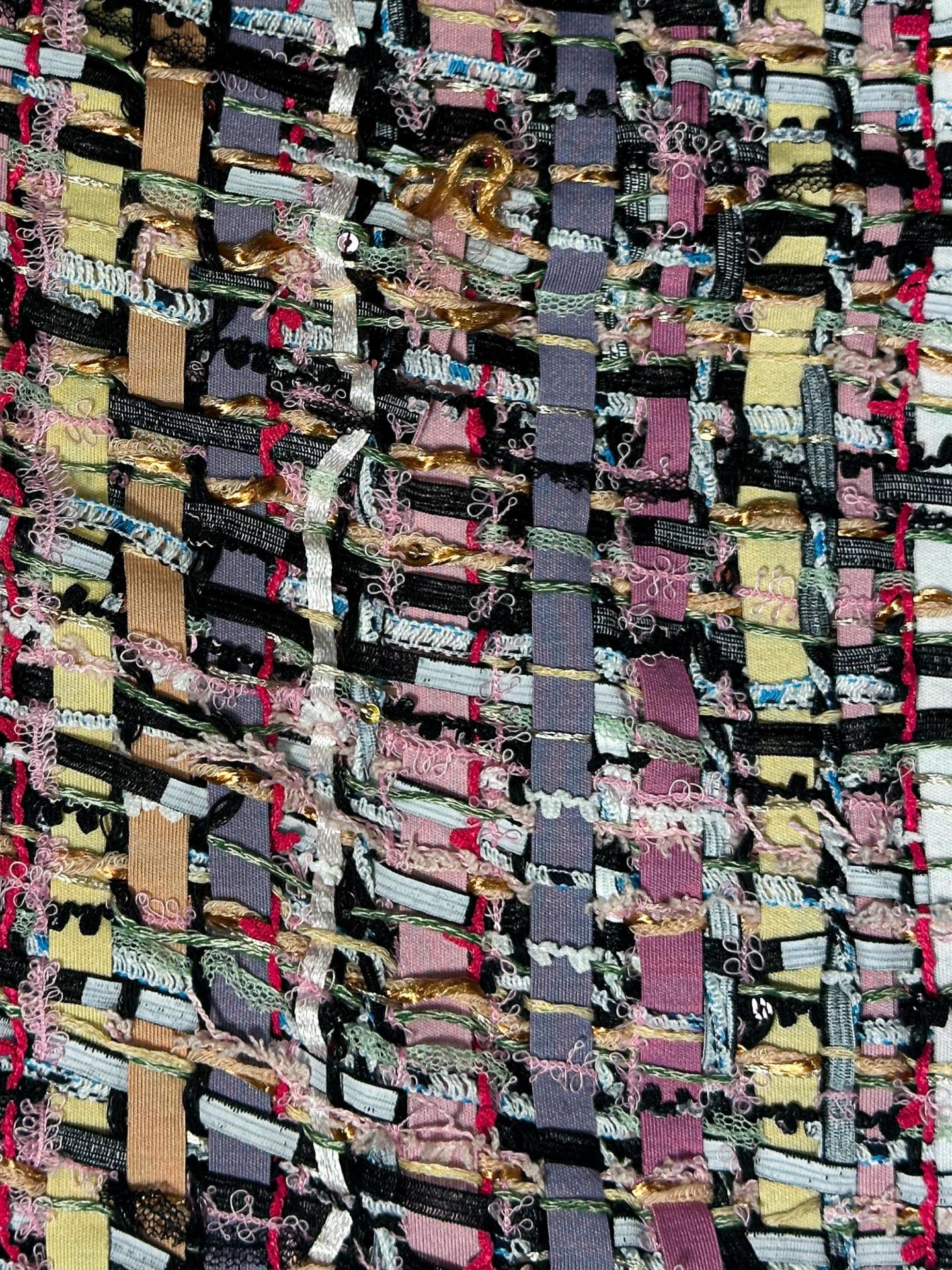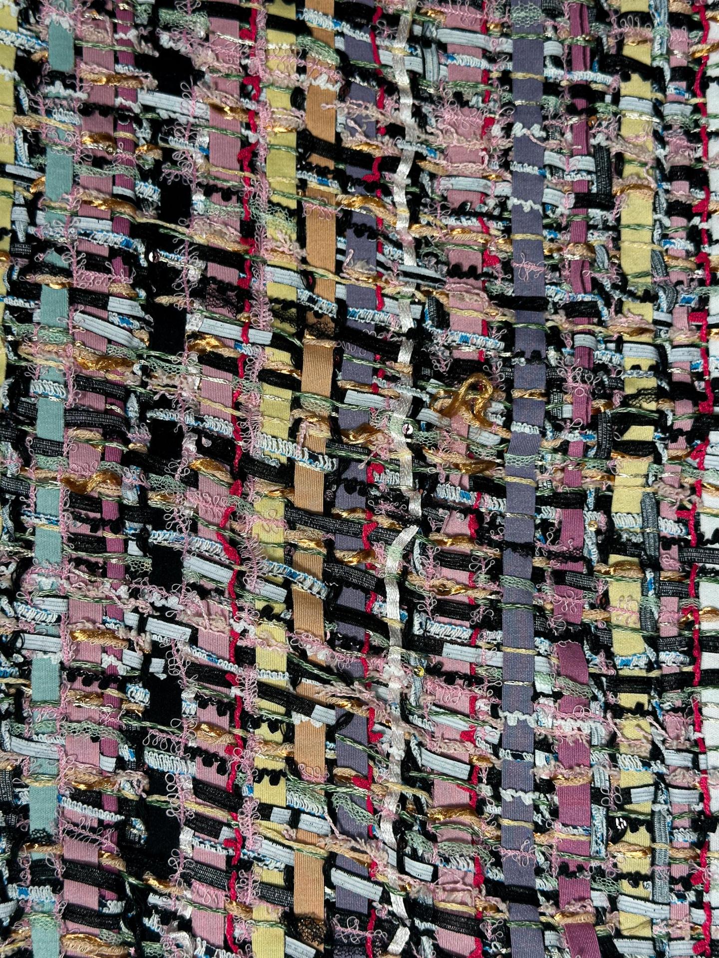 The Carnival Tweed Fabric is a celebration of color and craftsmanship. With a vibrant mix of pink, orange, yellow, mint, lilac, and black woven into an artfully chaotic grid, this fabric turns any piece into a statement. Rich in texture and full of personality, it's made for confident silhouettes and playful, fashion-forward designs.