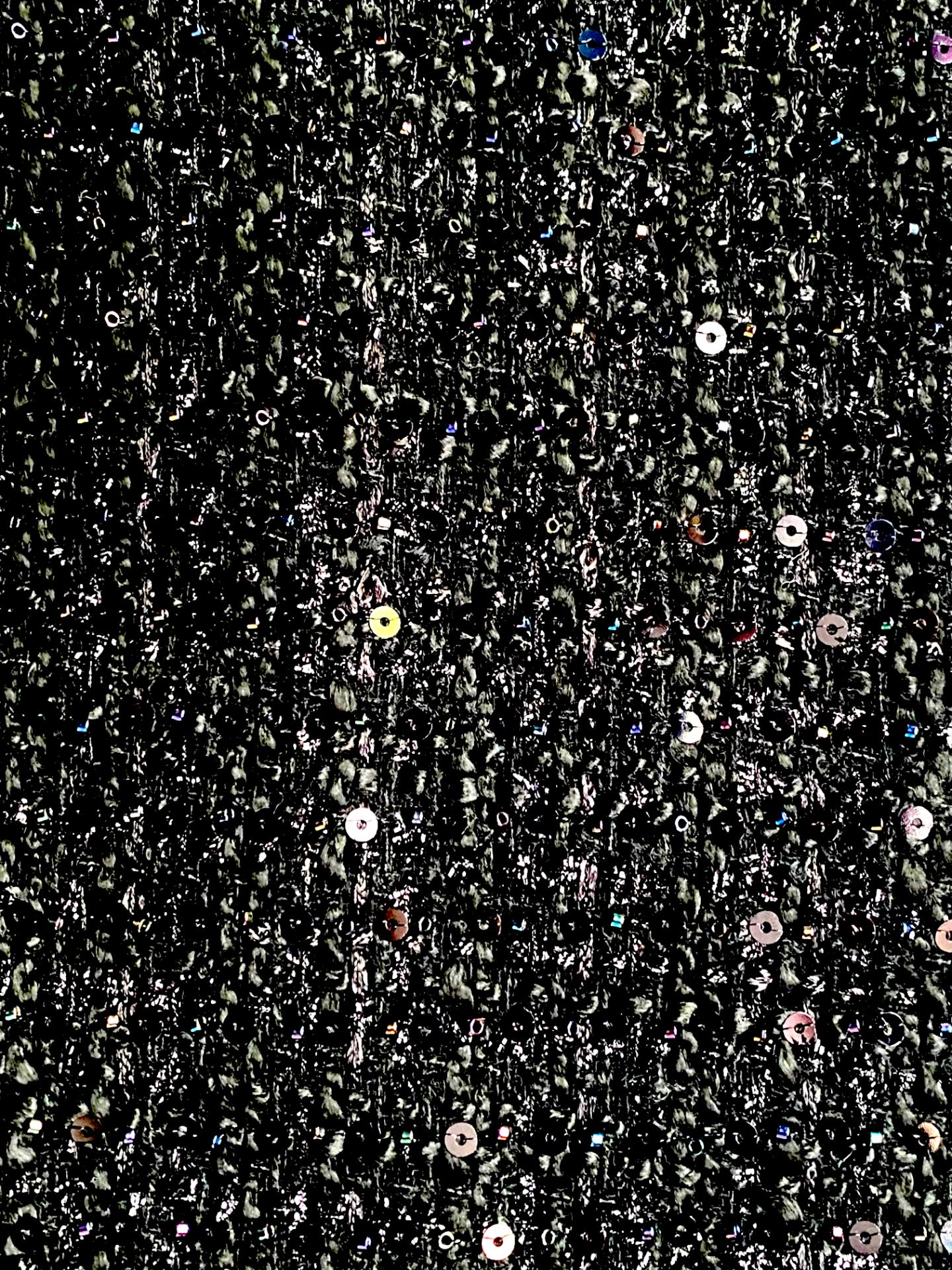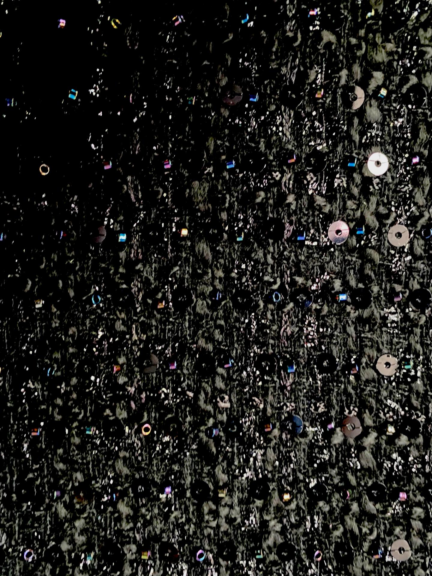 The Noir Gala Tweed Fabric brings high-glamour to heritage texture. With its deep black base woven from matte and glossy yarns, this fabric is accented by scattered iridescent sequins and shimmering threads, giving it a glint of elegance under the light. It’s perfect for eveningwear and show-stopping tailoring that captures both sophistication and sparkle.