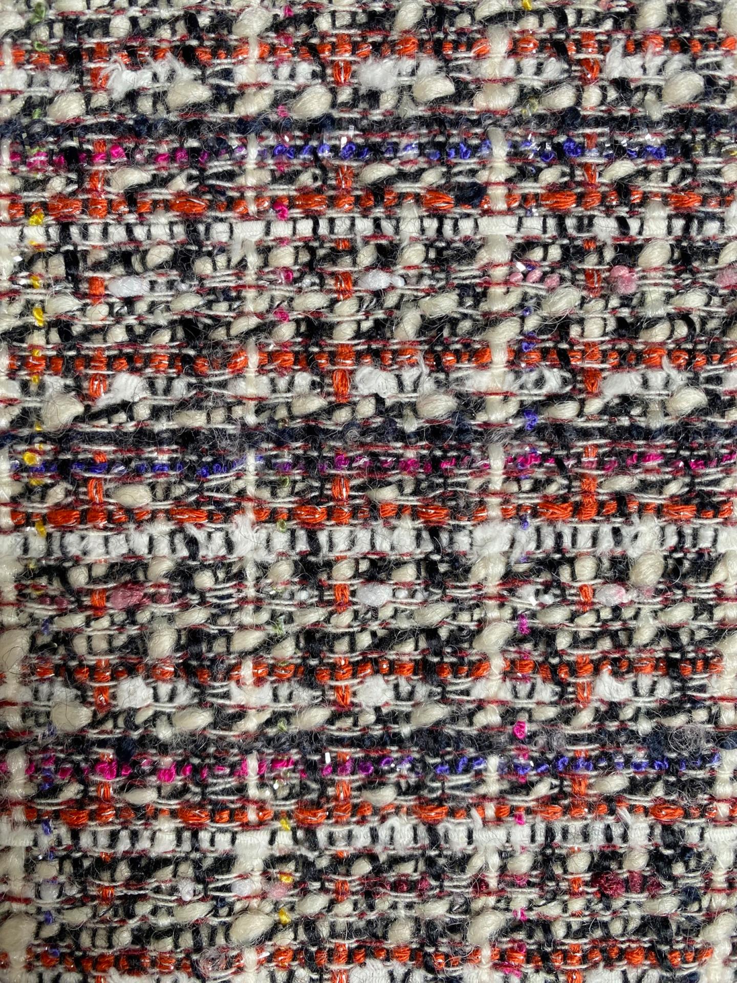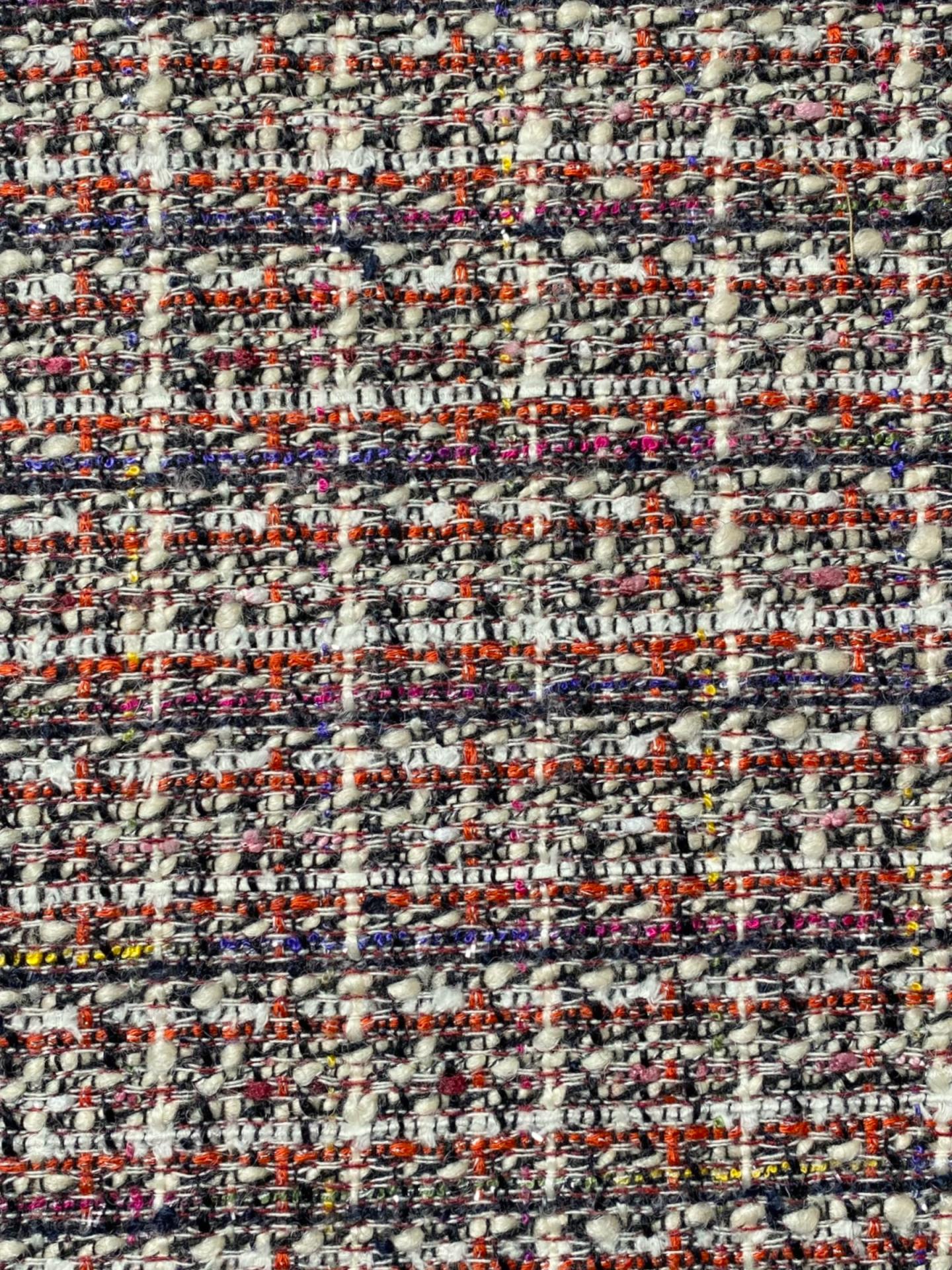 The Autumn Spice Tweed Fabric captures the essence of fall in a classic weave. Warm neutrals form the base, layered with a complex blend of cinnamon red, navy blue, and mustard yellow threads. The effect is cozy yet refined—perfect for timeless tailoring with seasonal flair.