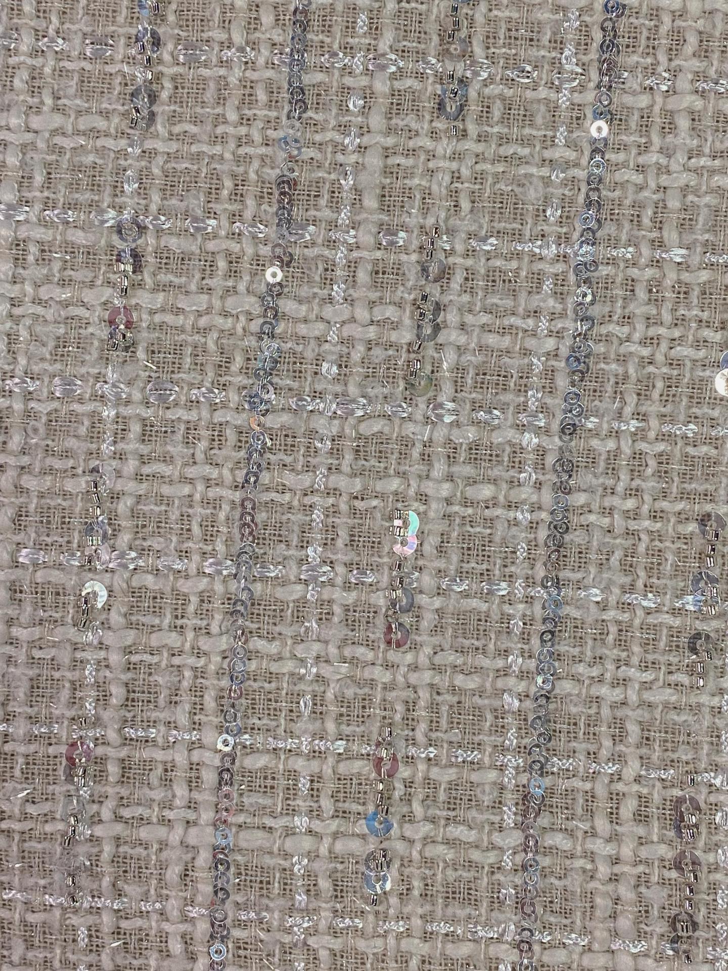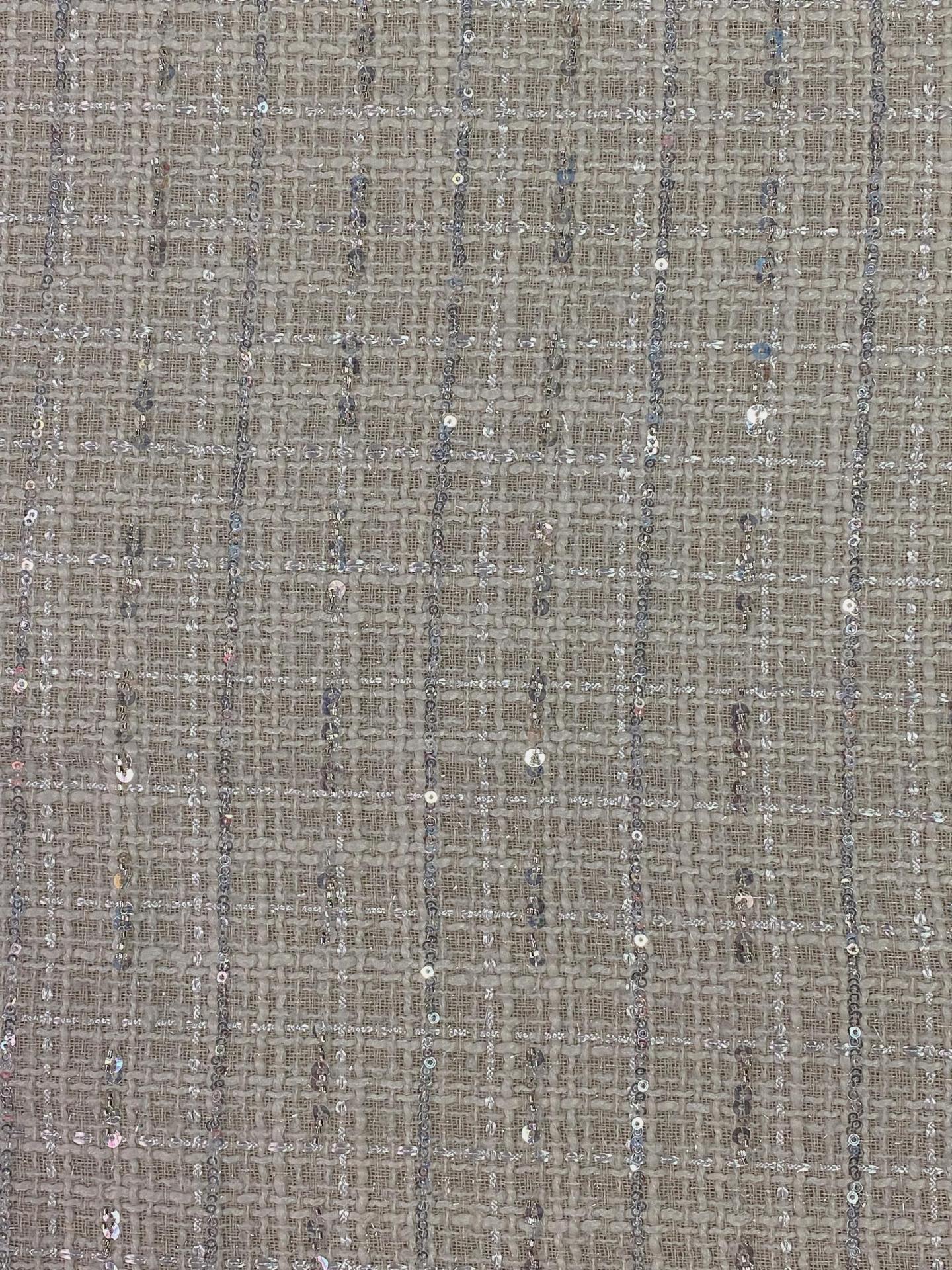 The Tweed Gabrielle is a refined take on classic tweed, offering a clean, soft gray base woven with delicate threads of shimmer for a touch of understated glamour. Its lightweight yet structured weave makes it ideal for chic tailoring, minimalist silhouettes, or modern wardrobe staples inspired by timeless Parisian elegance.