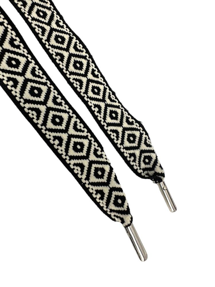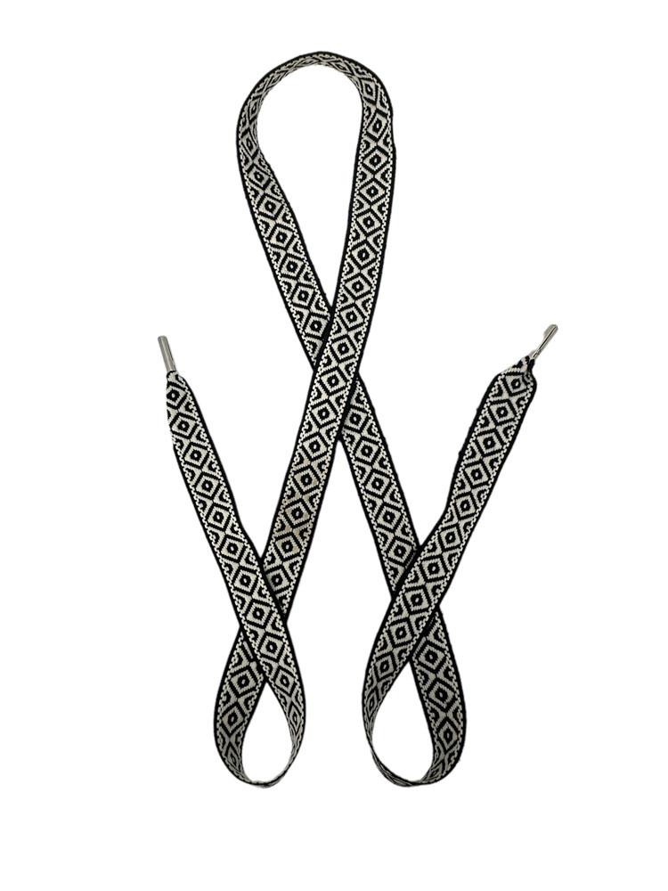 Add a touch of texture and tradition with the Tribal Diamond Shoelaces, featuring a striking black and white woven pattern inspired by classic tribal motifs. The bold geometric design pairs modern style with timeless influence, while sleek metal aglets add a clean, elevated finish. A perfect blend of craft and edge.