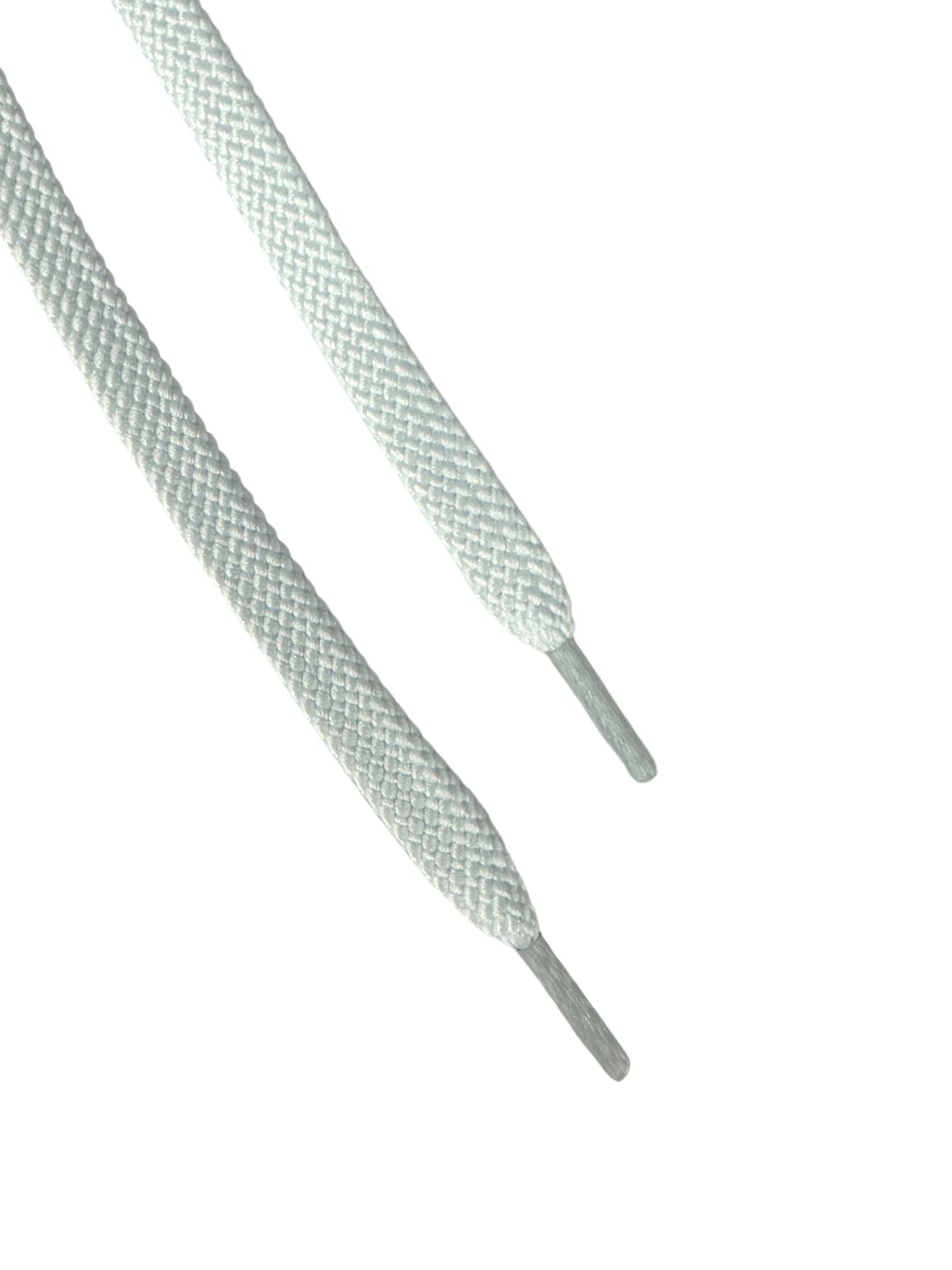 Flat white laces with stitched or heat-sealed fabric tips (no metal)