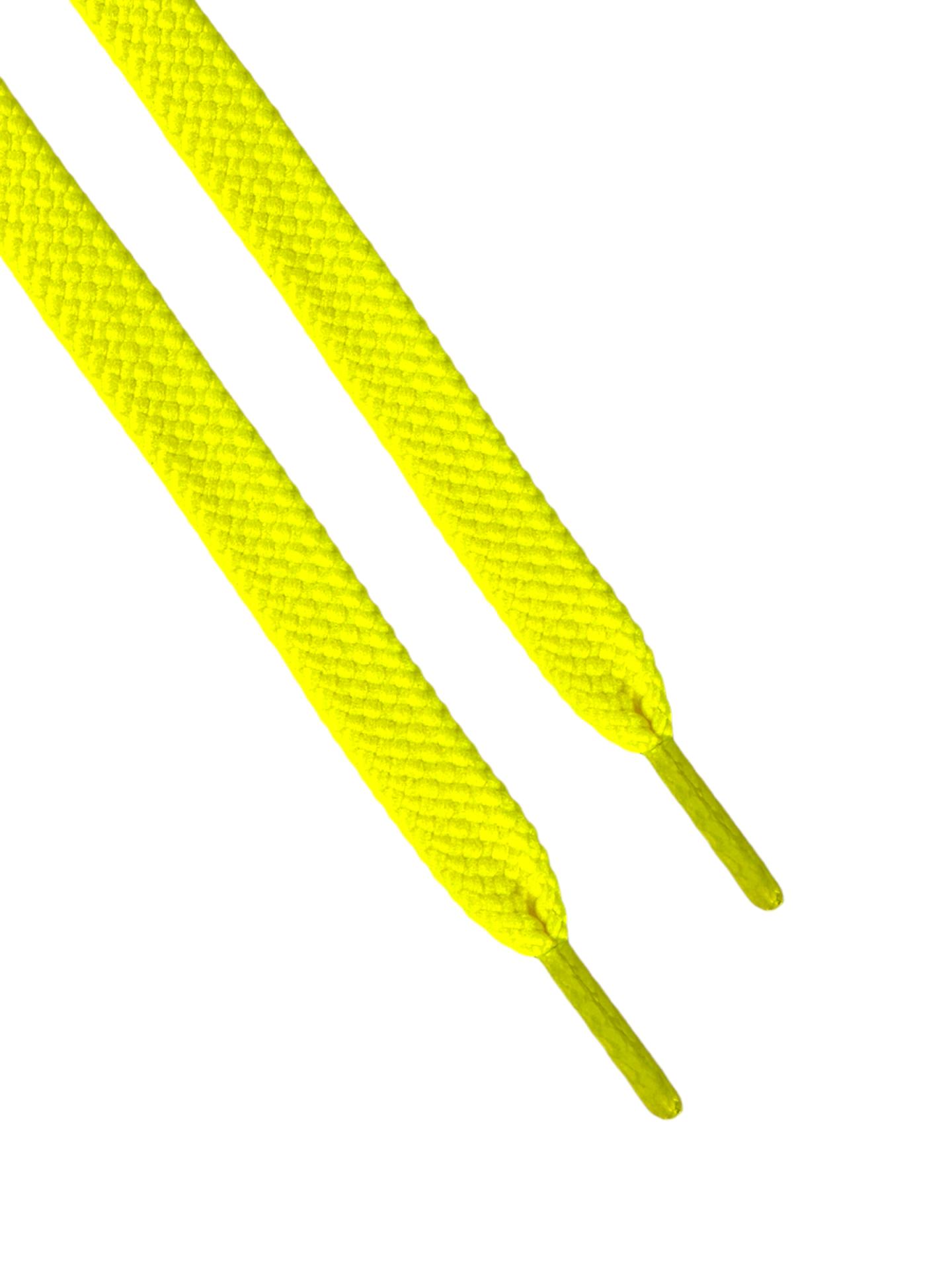 Flat neon yellow laces with stitched or heat-sealed fabric tips (no metal)