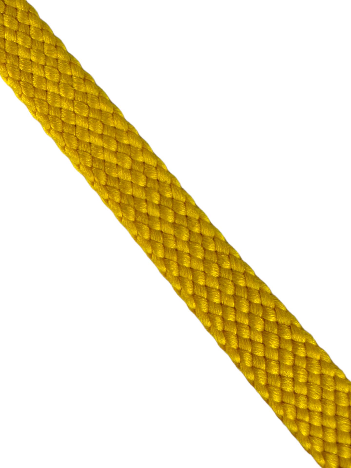 Flat yellow laces with stitched or heat-sealed fabric ends (no metal)