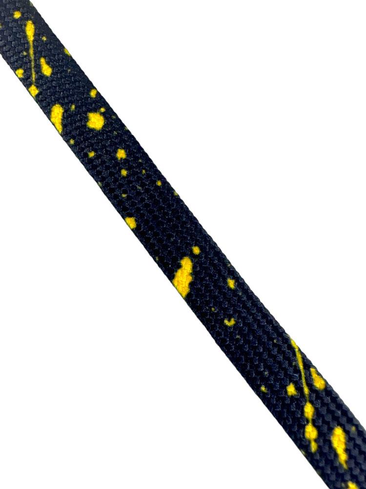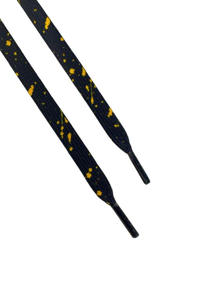 Black Flat Shoelaces with Yellow Paint Splatter and Fabric Ends