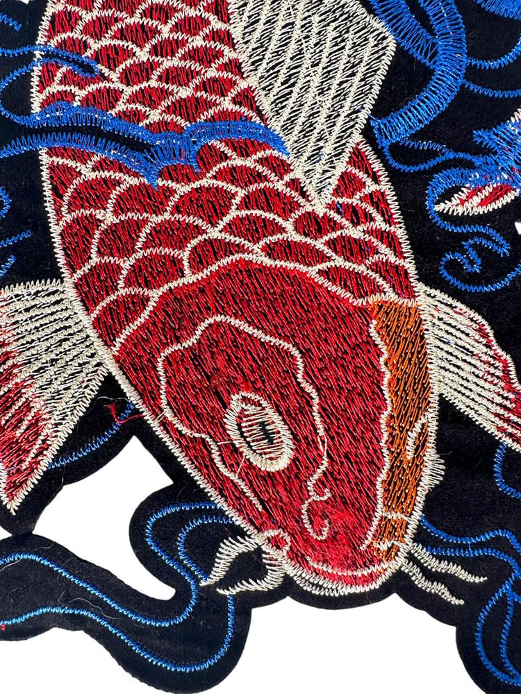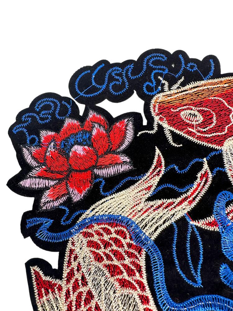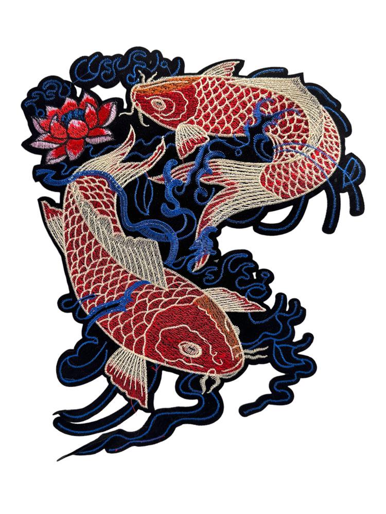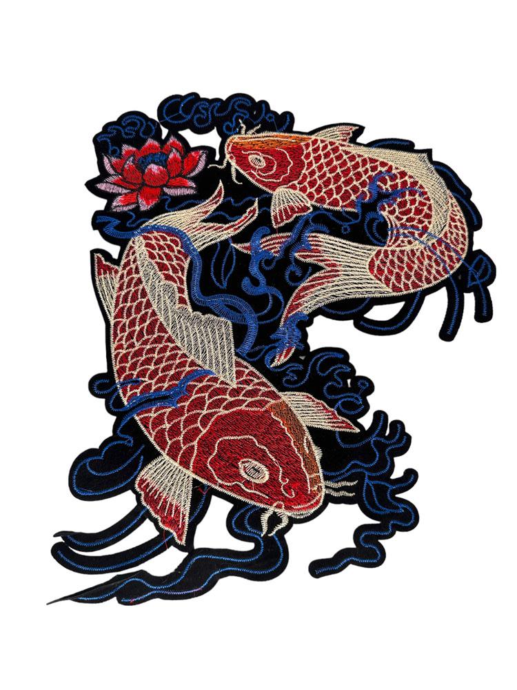Embroidered Patch Featuring Two Red Koi Fish in Yin-Yang Formation with Lotus