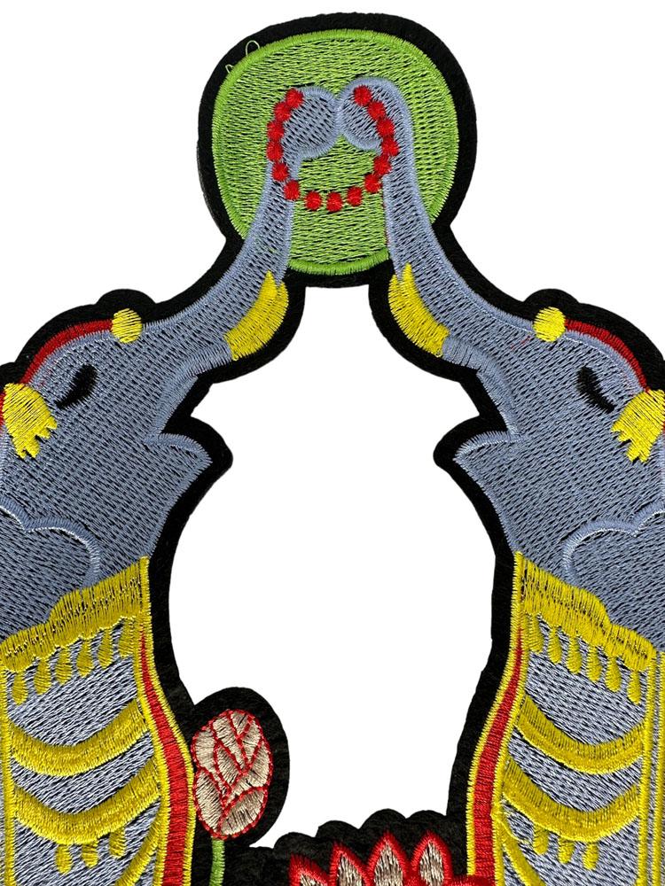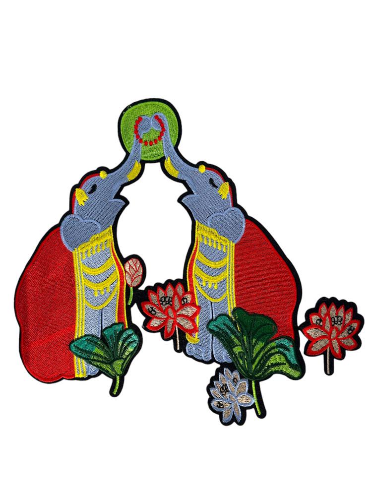 Embroidered Patch Featuring Two Mirrored Elephants in Ornate Robes with Floral Details