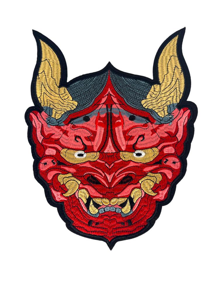 Embroidered Patch of a Red Japanese Demon Mask with Golden Horns
