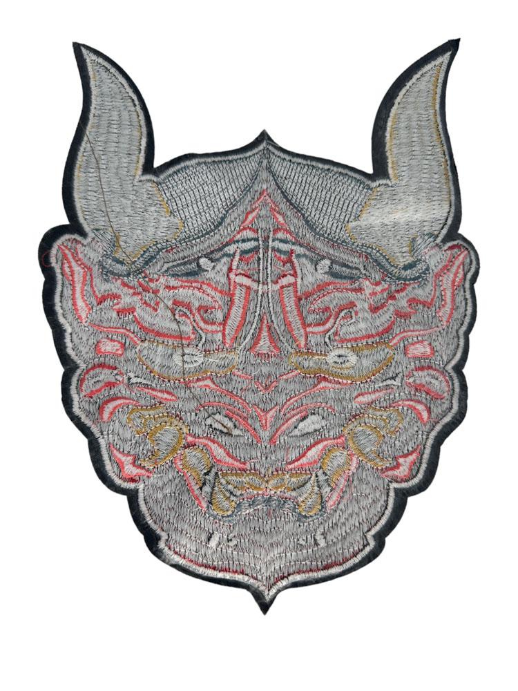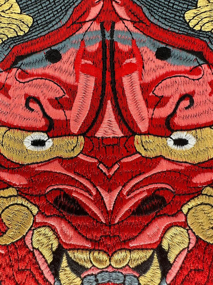 Detailed oni (demon) face with layered embroidery for 3D effect