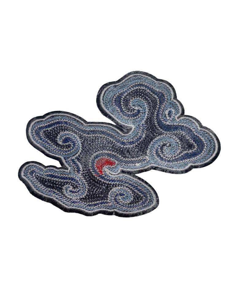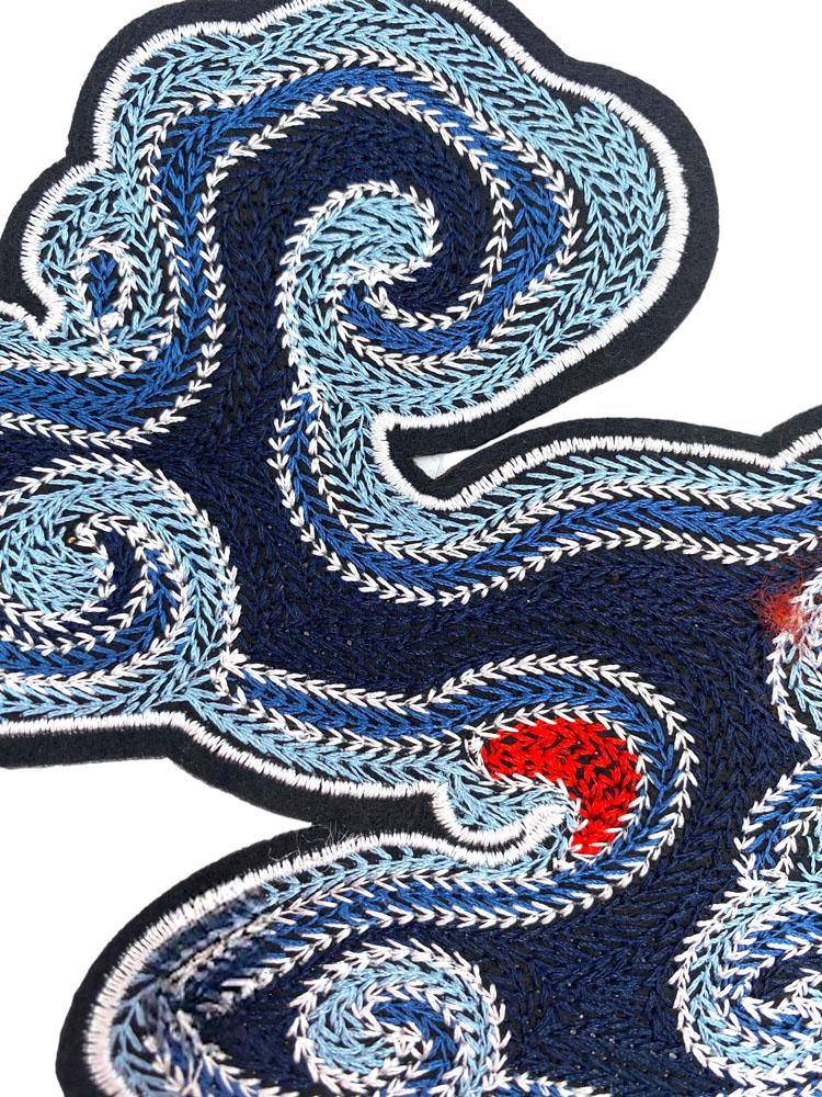 Let your style drift with intention in the Mystic Cloud Patch, a swirling embroidered motif that captures the fluid grace of traditional East Asian cloud forms. Rendered in layered shades of blue with silver threadwork and a single red core, this design embodies harmony, energy, and quiet strength—perfect for balancing bold designs with contemplative elegance.
