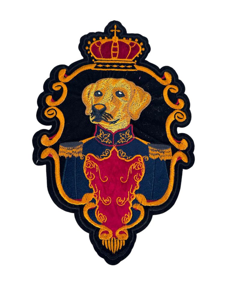 Elevate your look with loyal luxury in the Royal Retriever Patch, a richly embroidered emblem depicting a golden retriever dressed in royal attire and framed in an ornate coat of arms. Topped with a red crown and detailed with heraldic embellishments, this patch is perfect for canine lovers with a taste for classic grandeur.