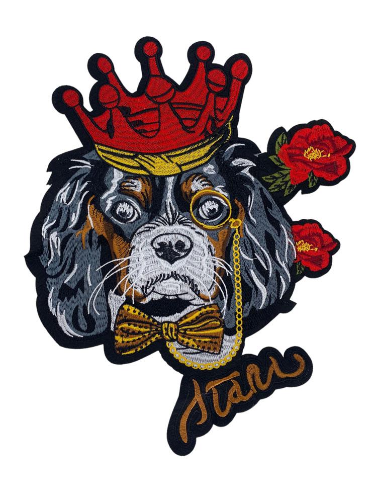 Embroidered Patch Featuring a Dog in a Red Crown with Roses and a Bow Tie