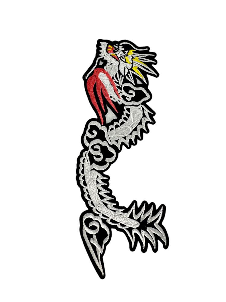 Make a bold statement with the Mythic Dragon Mermaid Patch, a powerful embroidered piece blending the elegance of a mermaid with the strength of a dragon. With flowing golden hair, a fierce red bodice, and a coiling silver-scaled dragon tail wrapped in stylized black clouds, this patch redefines mythical majesty in one stitched masterpiece.