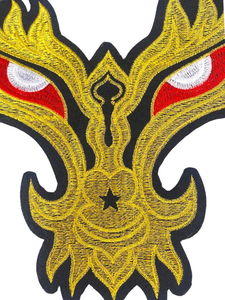 Embroidered Patch Featuring Stylized Fiery Eyes in Ornate Gold Mask Design