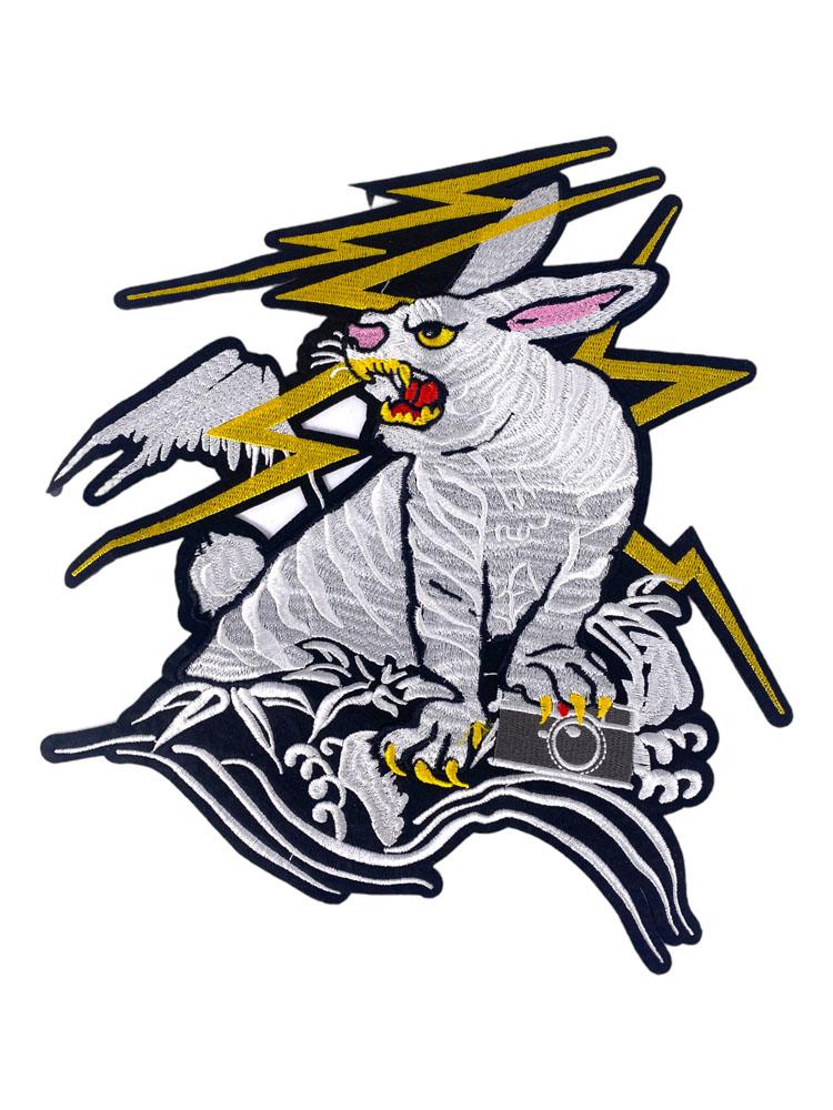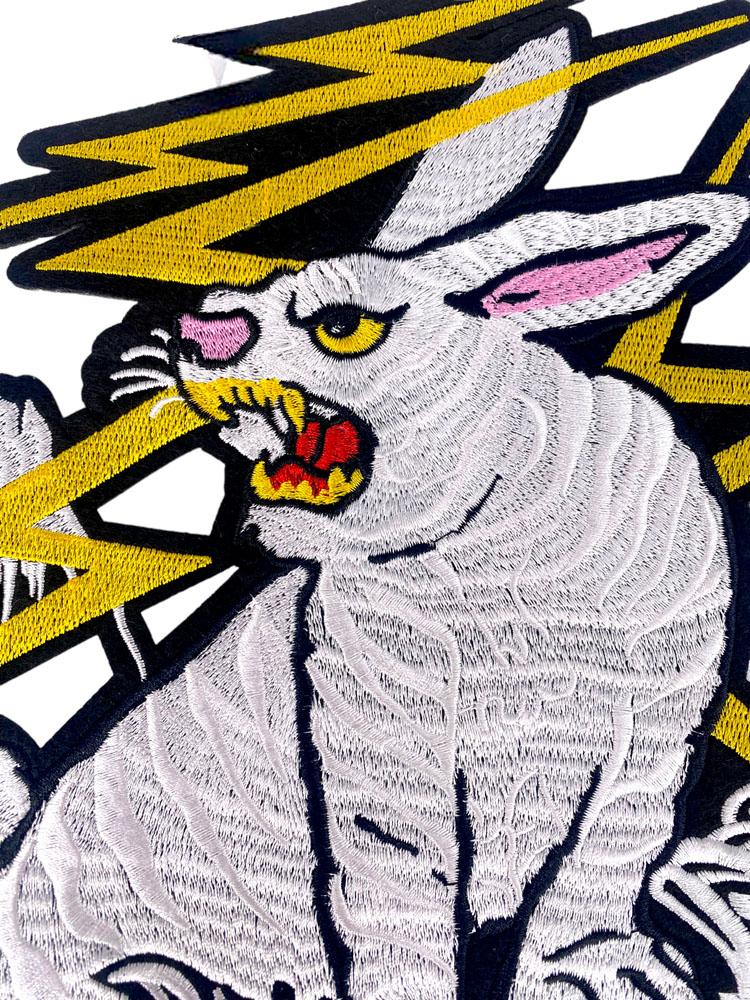 Unleash electrifying energy with the Lightning Bunny Patch, a high-voltage embroidered design featuring a mythical winged bunny surrounded by crackling gold lightning bolts. With piercing red eyes, bared fangs, and a commanding stance atop a wave of smoke and clouds, this patch radiates power, attitude, and other worldly edges.